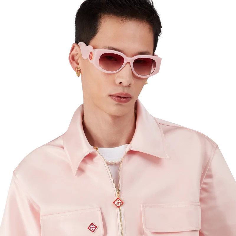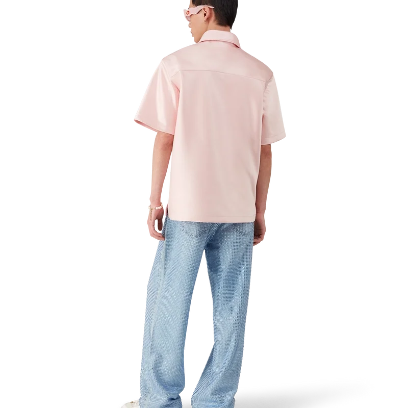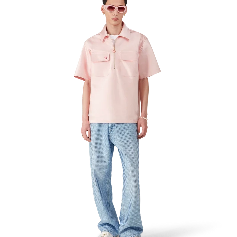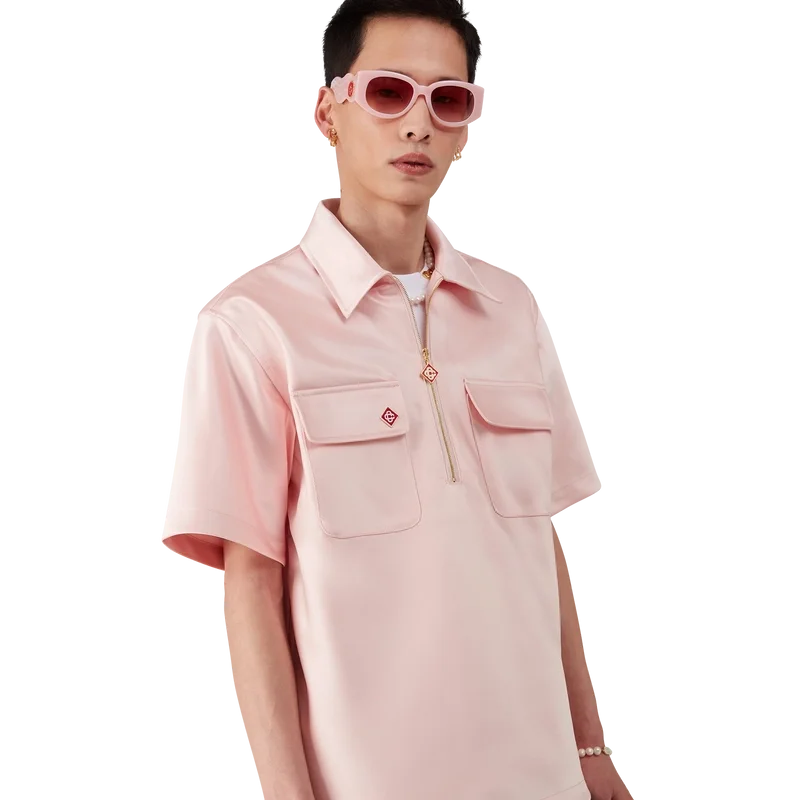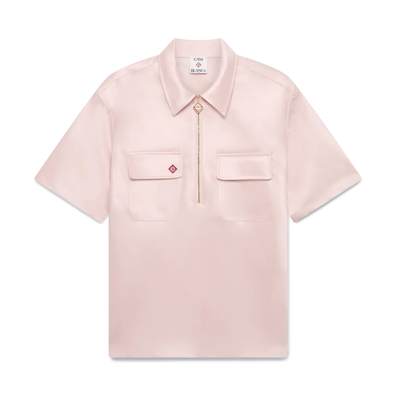 La camicia in raso con zip a un quarto è un modello a maniche corte realizzato in tessuto satinato. Rifinita con chiusura a zip con il logo a rombo iconico della Maison, colletto e tasche applicate con patta.