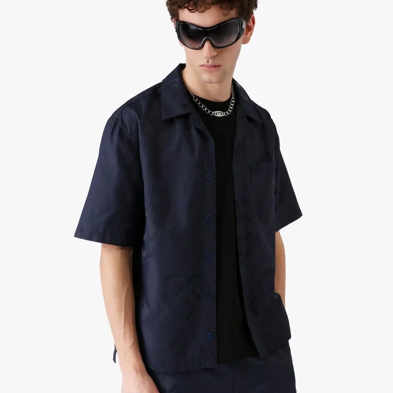 La camicia a pantaloncini con monogramma in mezzitoni blu navy presenta un design raffinato, caratterizzato dal monogramma della Maison che racchiude i simboli del marchio di tutte le stagioni, dal classico rombo al cuore e al sorriso CC. L’effetto mezzitoni crea una fusione di texture che simula un morbido bagliore, aggiungendo profondità. Completata da colletto alla cubana, chiusura con bottoni, bottoni in corozo con logo CC intrecciato e taschino sul petto.