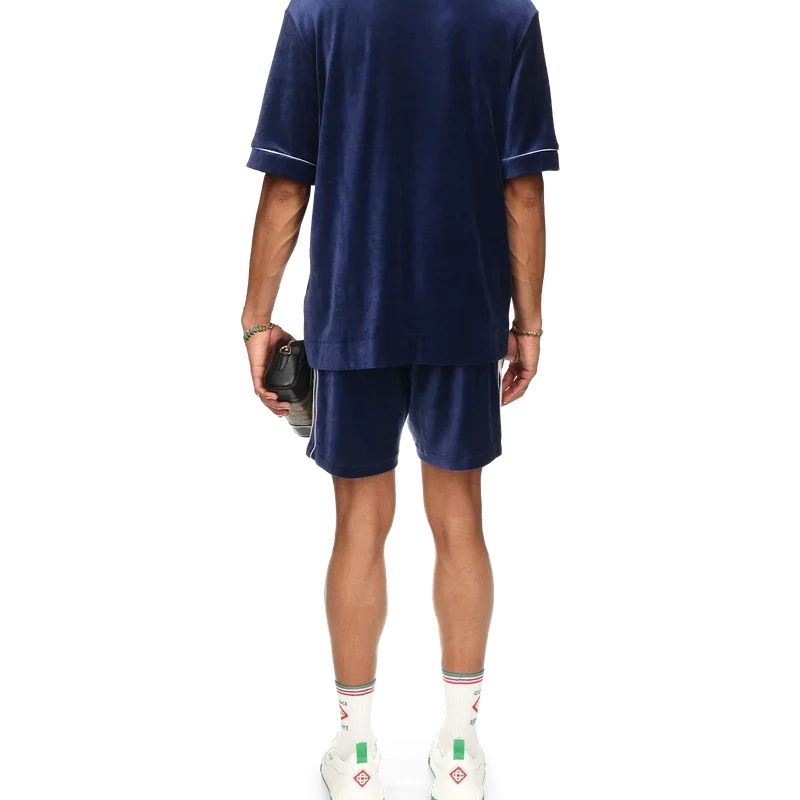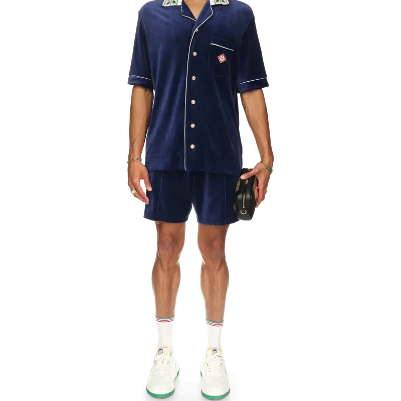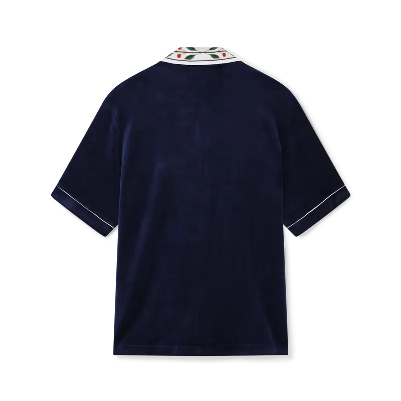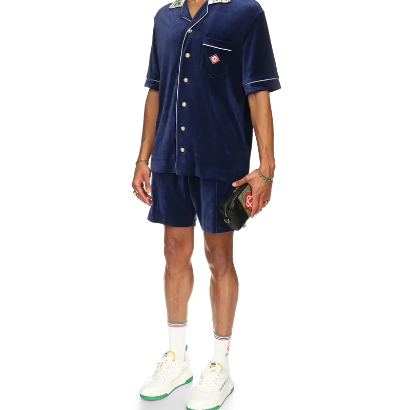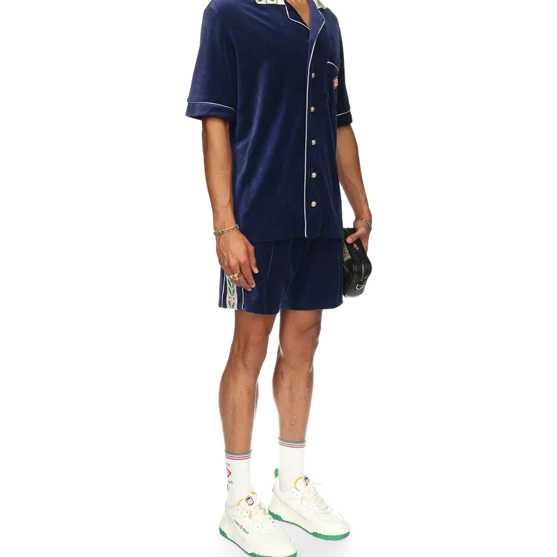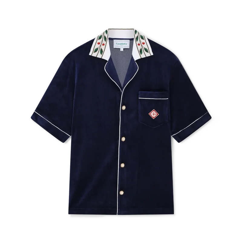 La camicia in velluto Laurel è un modello a maniche corte con il logo Casablanca sul taschino. Completa di taschino, chiusura frontale con bottoni, bottoni in madreperla con bordo dorato, bordino bianco su abbottonatura, polsini e taschino e colletto lavorato a maglia con il motivo Laurel, segno distintivo della Maison.