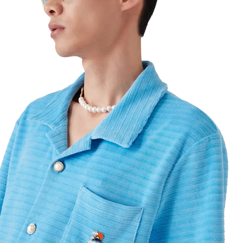 La camicia a righe in velluto a pantaloncini è un modello classico realizzato in tessuto di velluto a righe. Rifinita con colletto cubano, chiusura con bottoni, bottoni in madreperla con bordo dorato, taschino sul petto e spacchi laterali.