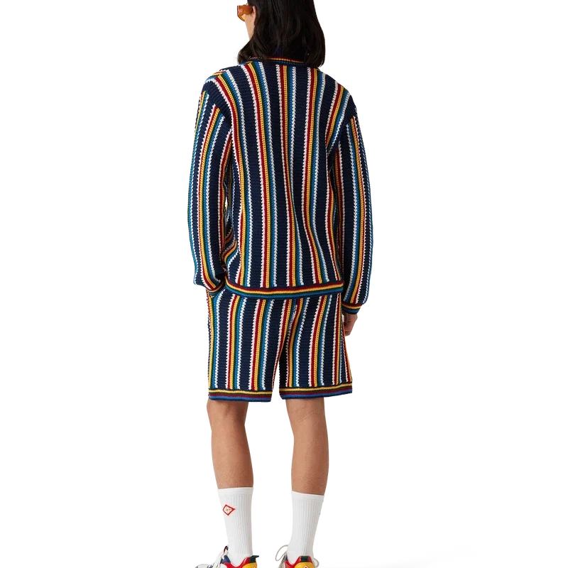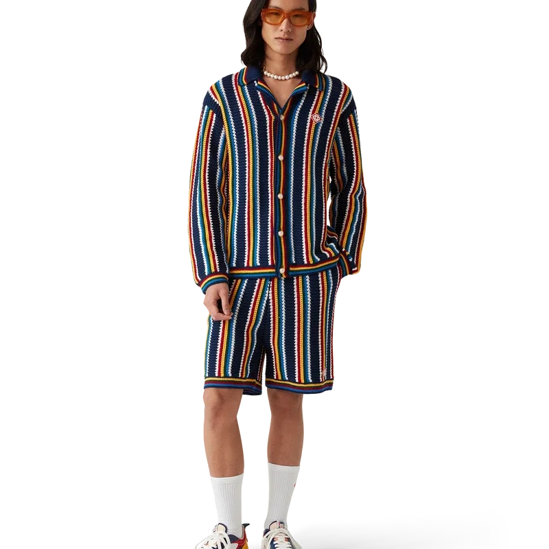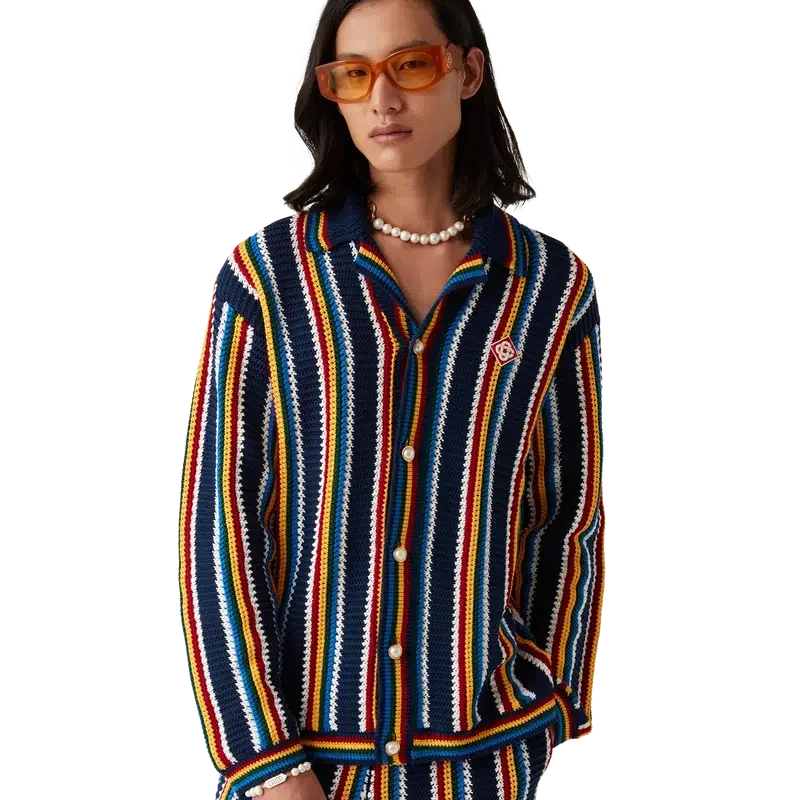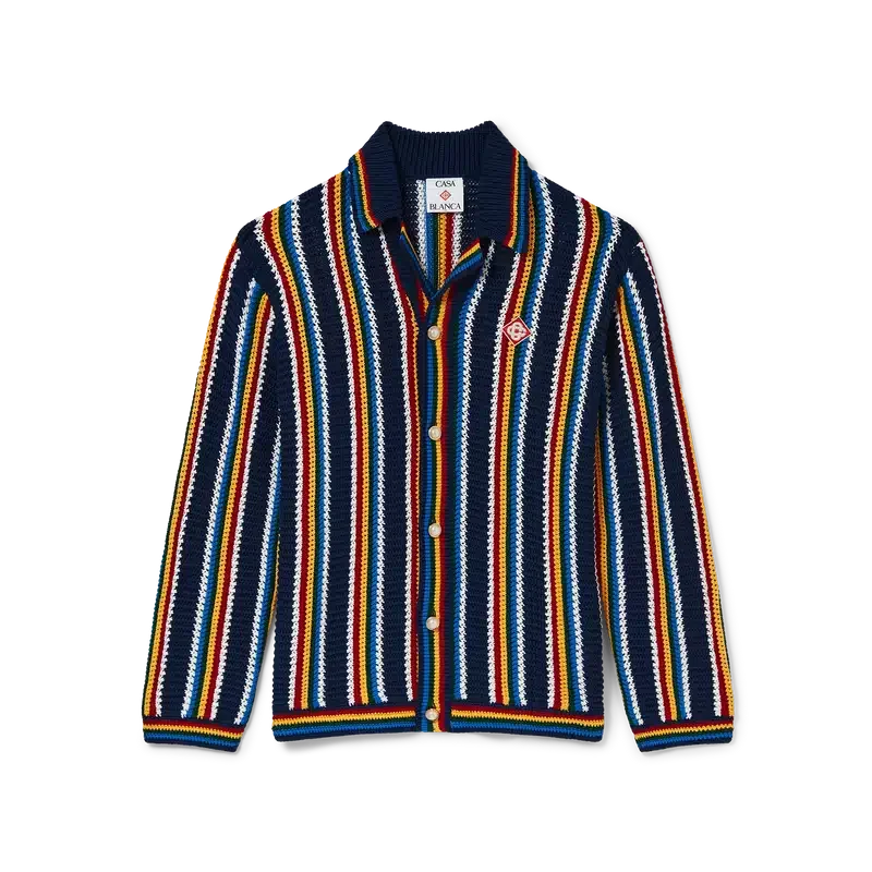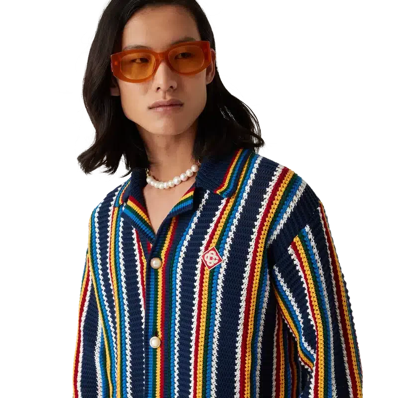 La camicia a righe in crochet è un modello a maniche lunghe con texture a righe, realizzato in tessuto di cotone lavorato all’uncinetto e impreziosito dal caratteristico logo a rombi della Maison. Rifinita con collo, polsini, orlo e abbottonatura a costine, bottoni in madreperla con bordo dorato e chiusura frontale con bottoni.