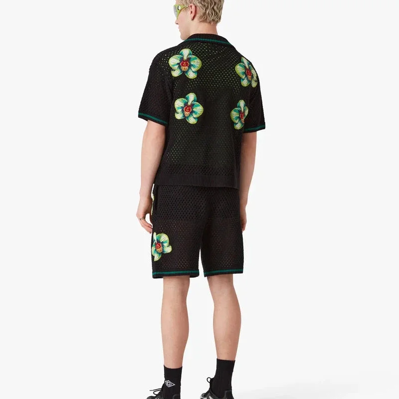 La camicia all’uncinetto a maniche corte con ricamo Glitch Orchid presenta un design raffinato, caratterizzato da un motivo che rappresenta la filosofia del contrasto tra natura e creazione umana, che lavorano in armonia per mostrare la bellezza naturale del fiore di orchidea. Rifinita con orlo a costine, abbottonatura, colletto alla cubana, chiusura con bottoni e bottoni in madreperla con bordo dorato.