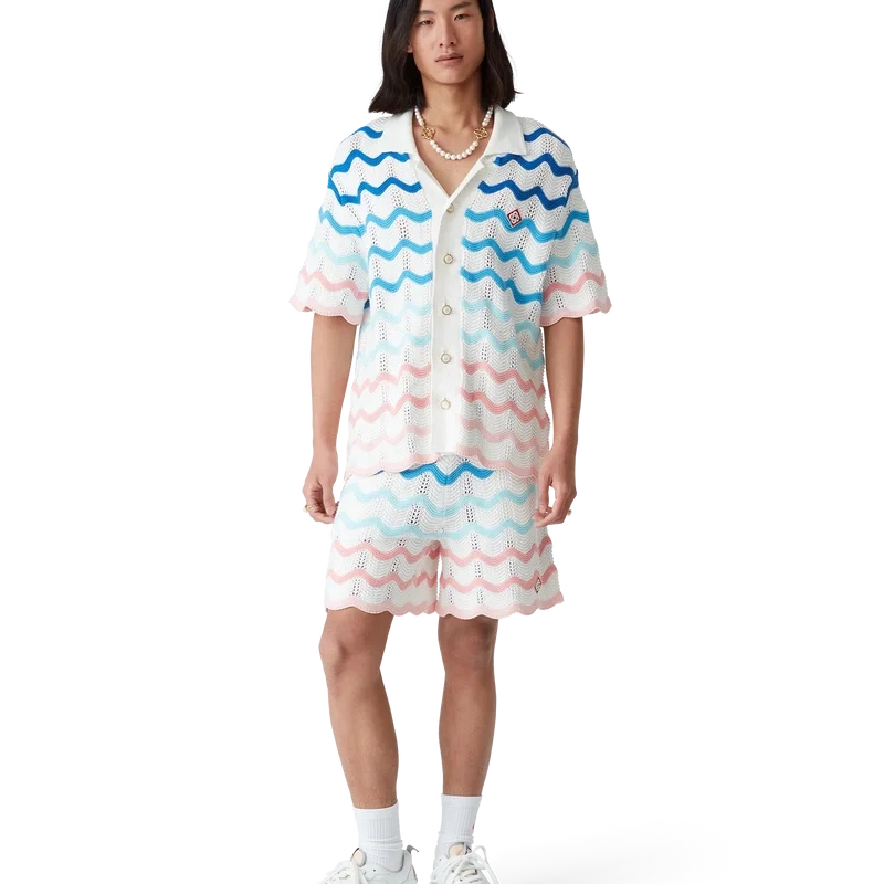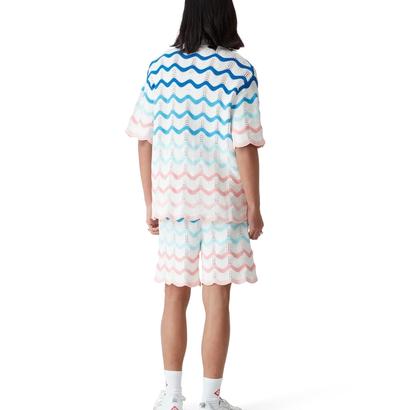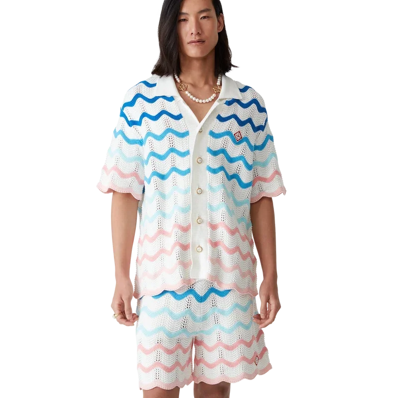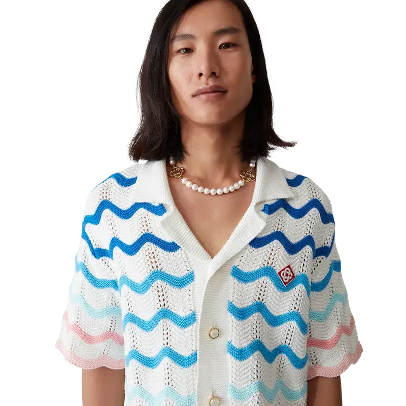 La camicia all’uncinetto Gradient Wave è un modello a maniche corte realizzato in tessuto di cotone all’uncinetto e caratterizzato dall’elemento di design ispirato alle onde di Memphis. Completata da chiusura con bottoni, logo a diamante della Maison, colletto cubano, bottoni in madreperla con bordo dorato e dettaglio con motivo a onde sul bordo.