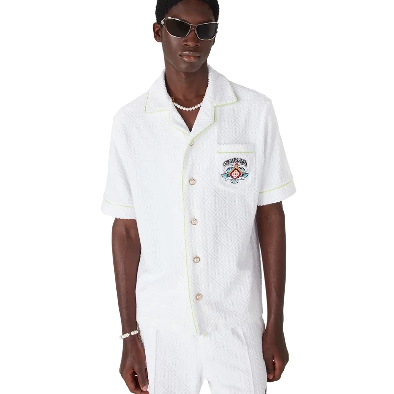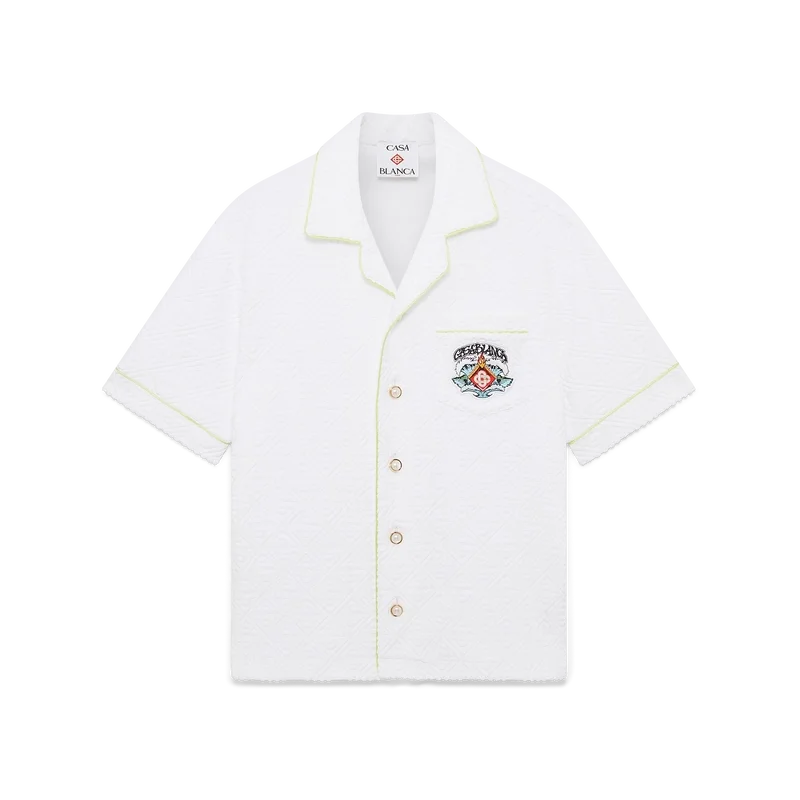 La camicia in spugna con monogramma è un raffinato modello a maniche corte che presenta la grafica “Innocence” della stagione, raffigurante una scena oceanica al tramonto con un’isola al centro, realizzata in uno stile influenzato dalla classica arte delle T-shirt da surf. L’illustrazione cattura la bellezza eterea dell’ora d’oro sulle acque tropicali, presentando una visione idealizzata del paradiso balneare attraverso la raffinata lente sport-leisure della Maison. Completata da un colletto in stile cubano, un taschino sul petto, chiusura con bottoni, bottoni in madreperla con bordo dorato e dettagli a piping su colletto, polsini e abbottonatura.