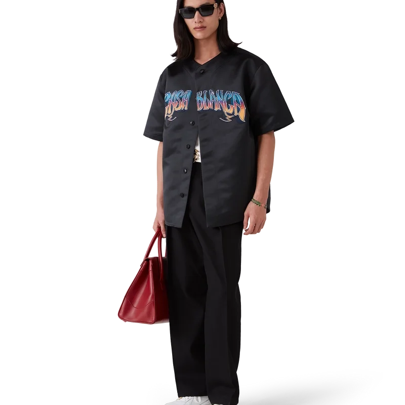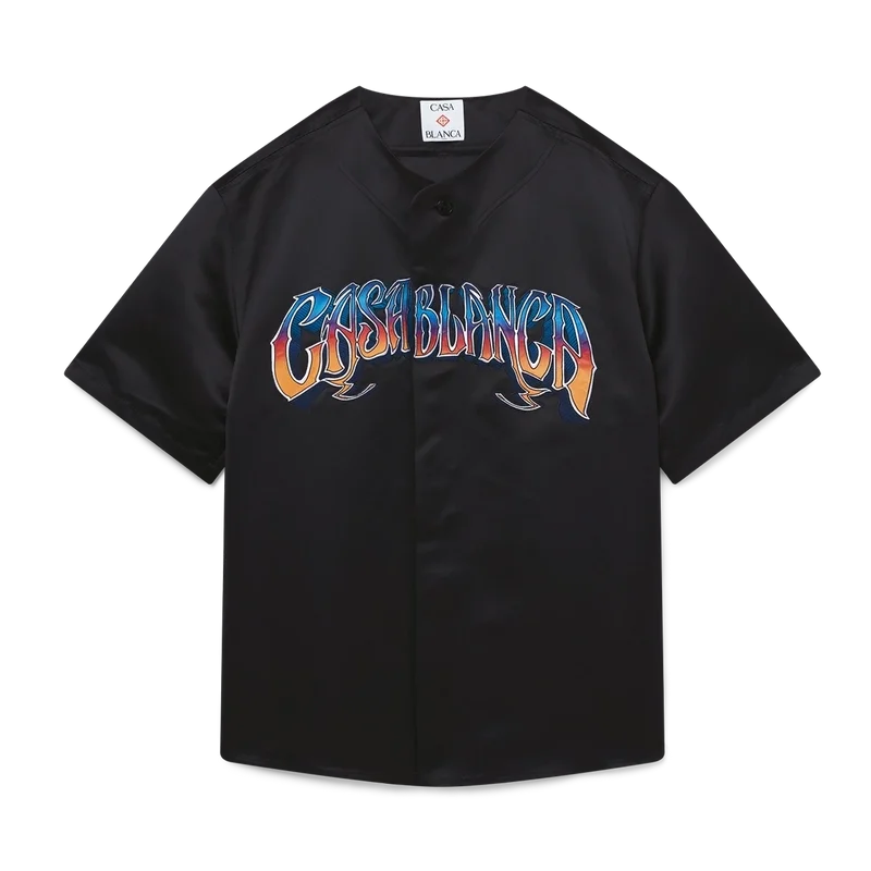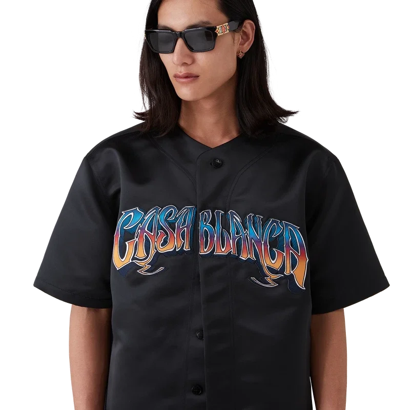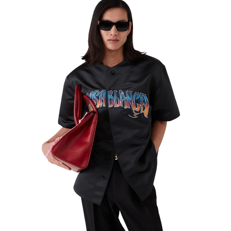 La maglietta da baseball in stile gotico è un modello a maniche corte realizzato in tessuto satinato e caratterizzato dal logo Casablanca della Maison. Completata da chiusura con bottoni, bottoni in corozo con logo CC intrecciato e tipografia disegnata a mano del logo Casablanca nella sfumatura di stagione, ispirata al carattere gotico utilizzato nei tatuaggi.