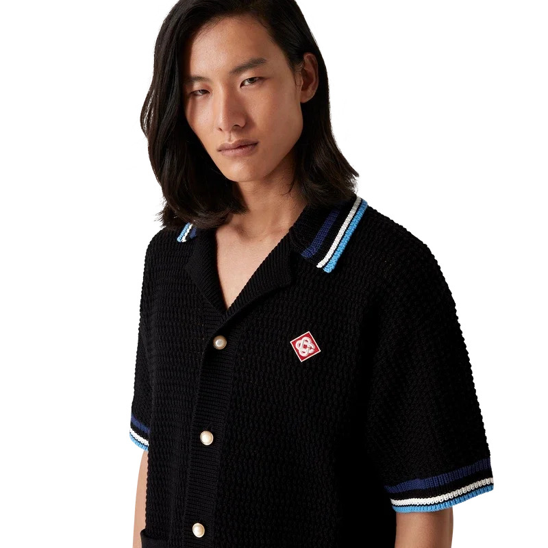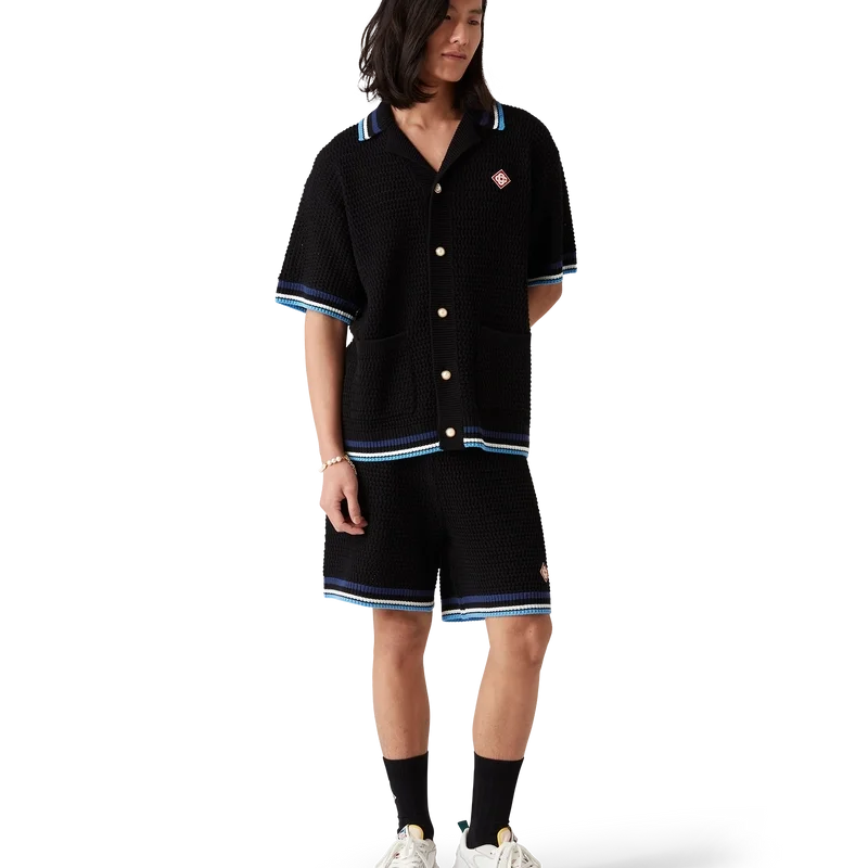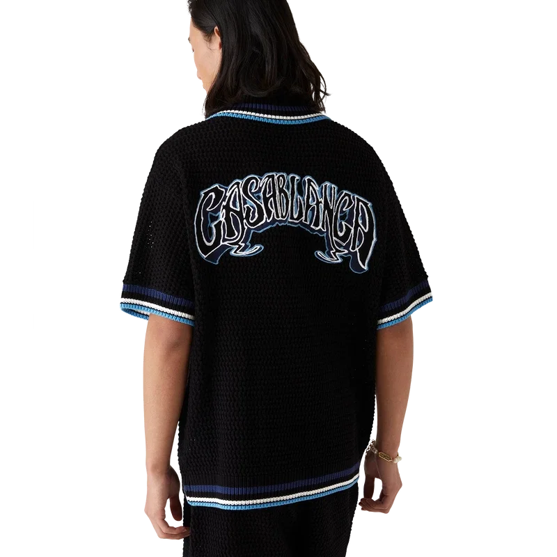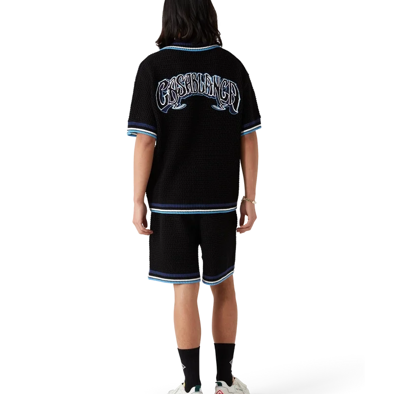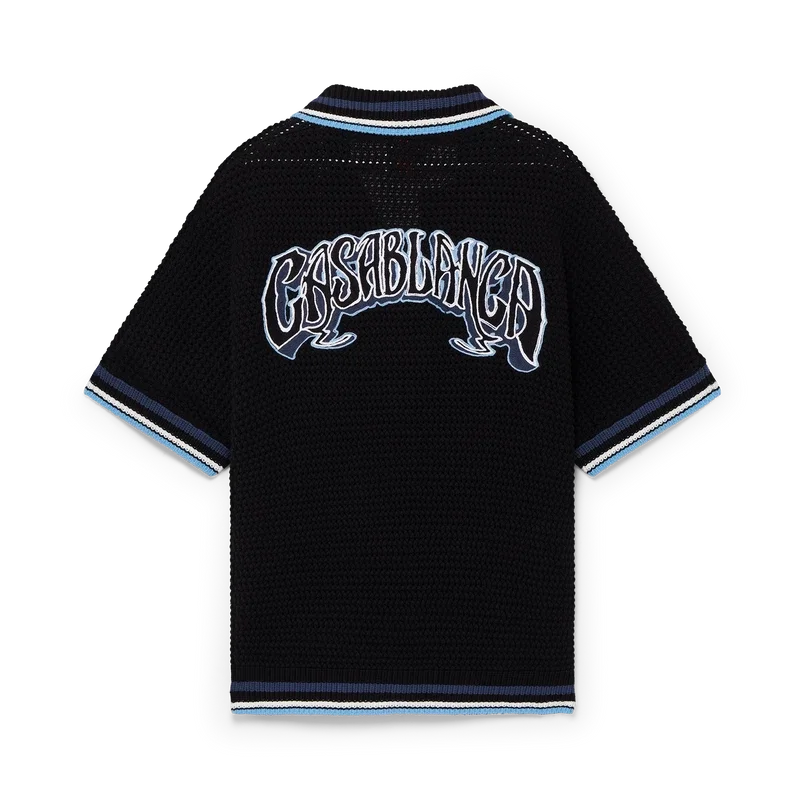 La camicia Gothic Crochet è un modello a maniche corte realizzato in tessuto di cotone all’uncinetto e impreziosito dal caratteristico logo a forma di diamante della Maison. Completata da bottoni in madreperla con bordo dorato, tasche applicate sul davanti, logo Casablanca in caratteri tipografici disegnati a mano ispirati al carattere gotico utilizzato nei tatuaggi e dettagli a righe sul colletto, sui polsini e sull’orlo.