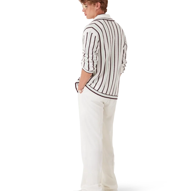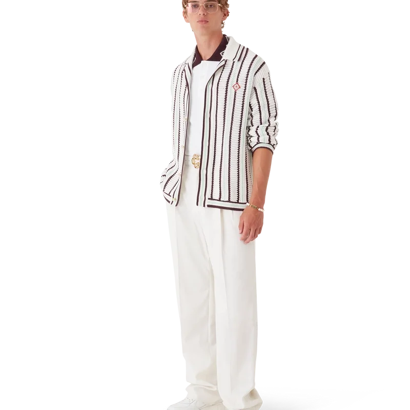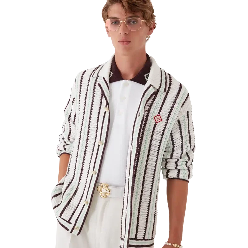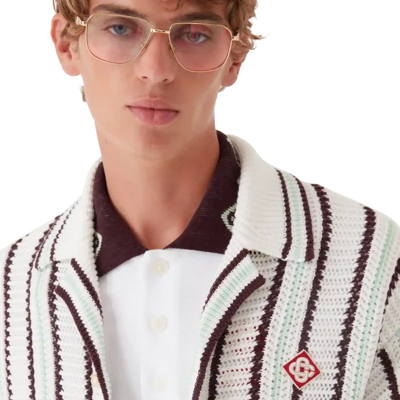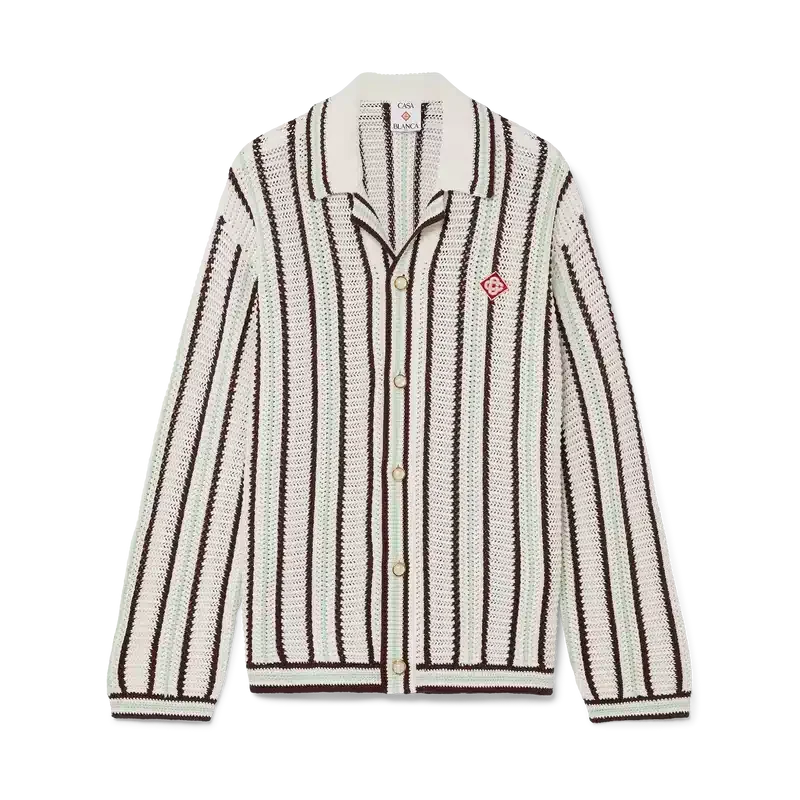 La camicia in cotone all’uncinetto a righe è un modello a maniche lunghe realizzato in tessuto all’uncinetto misto cotone con il logo a diamante iconico della Maison. Rifinita con collo, polsini, orlo e abbottonatura a costine, bottoni in madreperla con bordo dorato e chiusura frontale con bottoni.