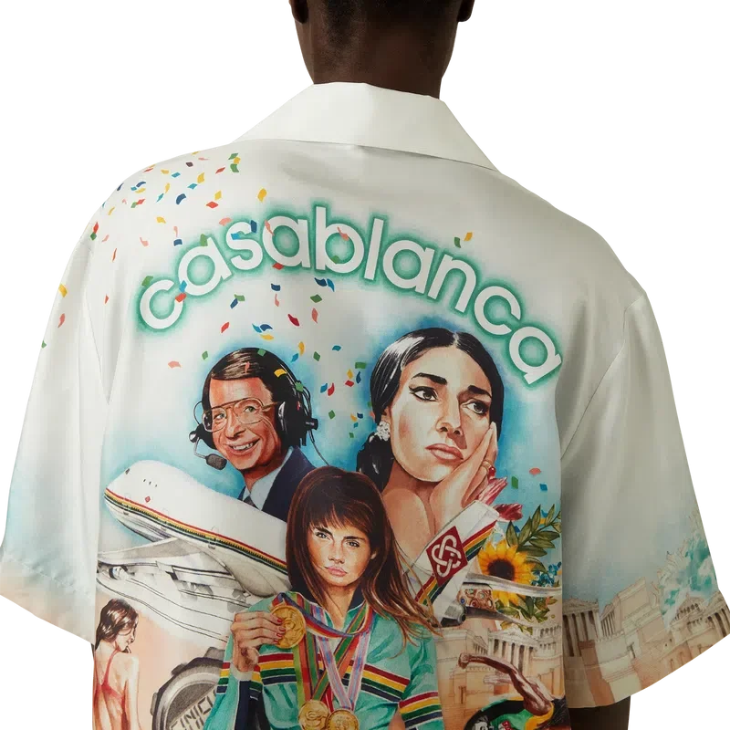 La camicia in seta Celebration Du Sport è un modello a maniche corte con stampa all-over, realizzata in twill di seta con una grafica stagionale ispirata al gioco della Maison sul layout di un classico poster cinematografico con i nostri personaggi in quel mondo. Completata con i caratteristici bottoni in corozo con logo CC intrecciato, chiusura a bottoni nascosta, taschino sul petto e colletto cubano.
