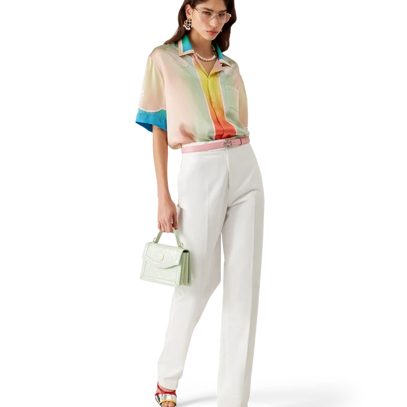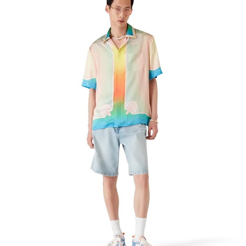 Completata da colletto cubano, chiusura con bottoni nascosti, bottoni in corozo con logo CC intrecciato, taschino sul petto e dettaglio con bordi sfumati nei colori dell’arcobaleno su colletto, abbottonatura, polsini e orlo.