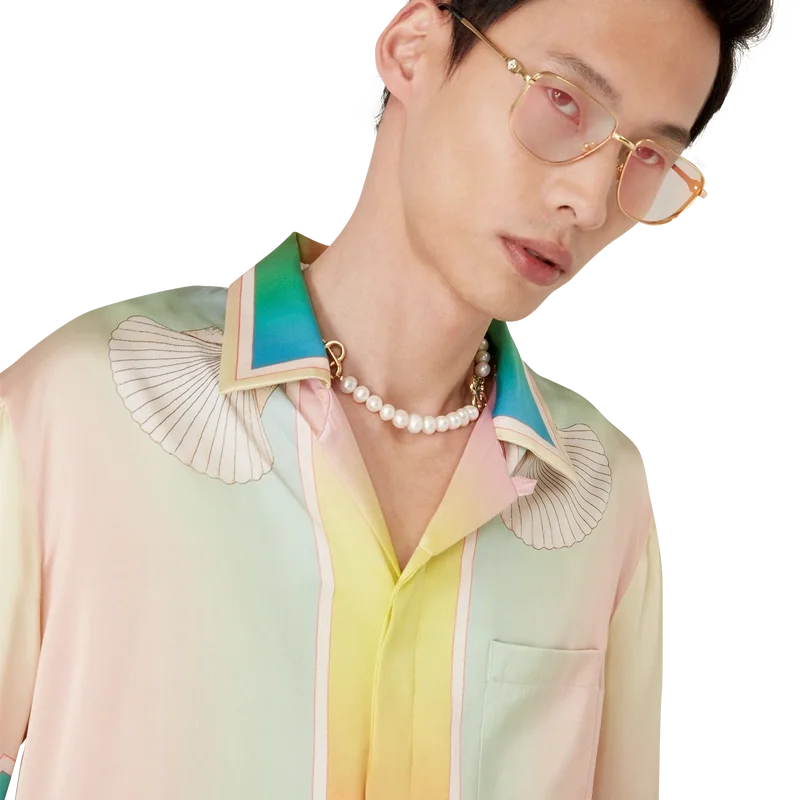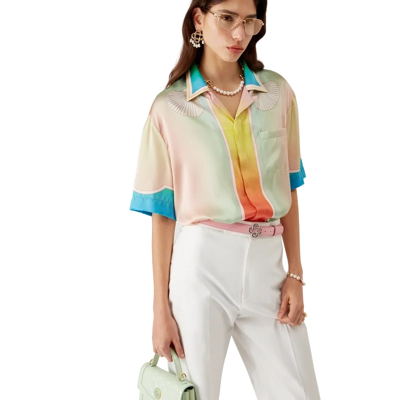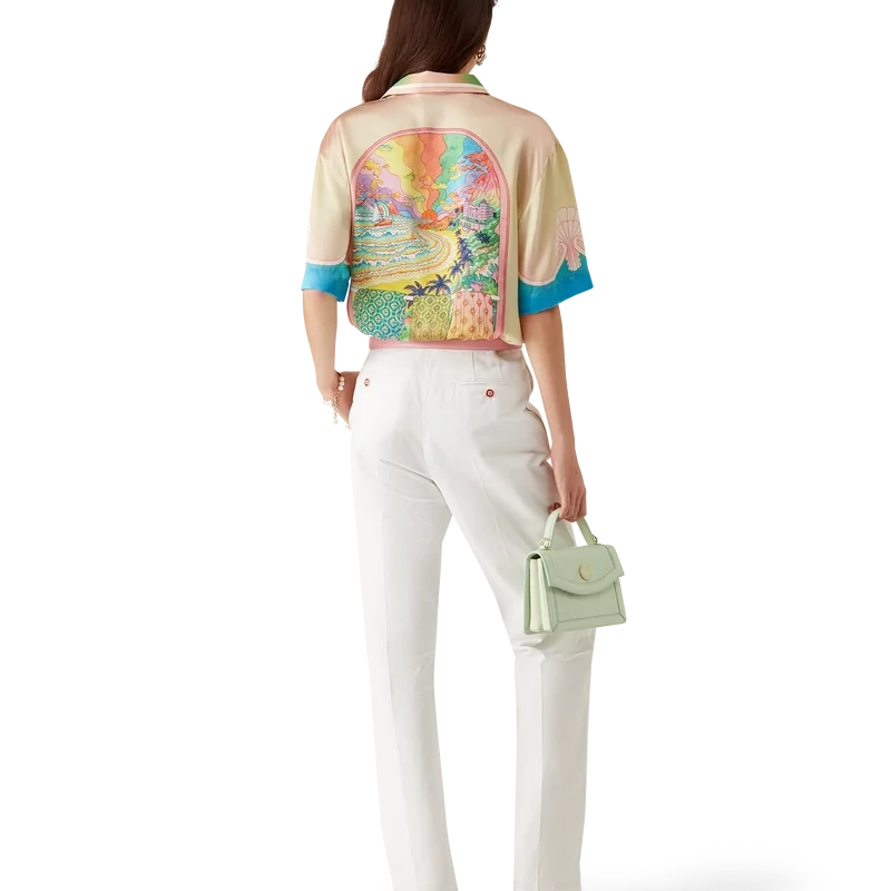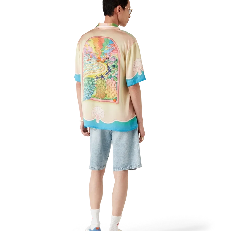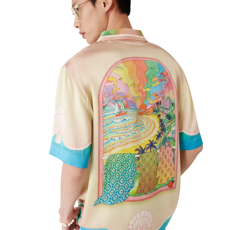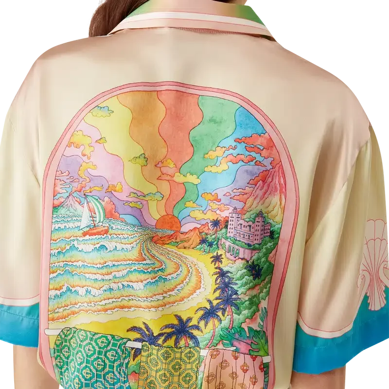 La camicia in seta a maniche corte Lucid Dreams presenta una stampa all-over con il motivo iconico della Maison: colori vivaci che raffigurano una vista immaginaria attraverso una finestra ad arco, realizzata in raso di seta.