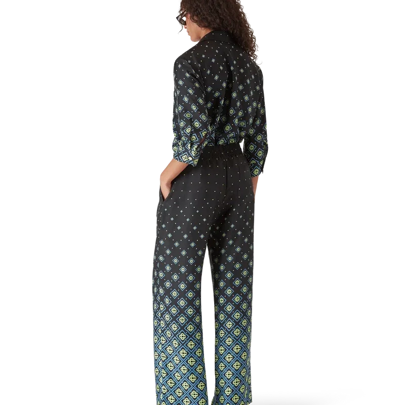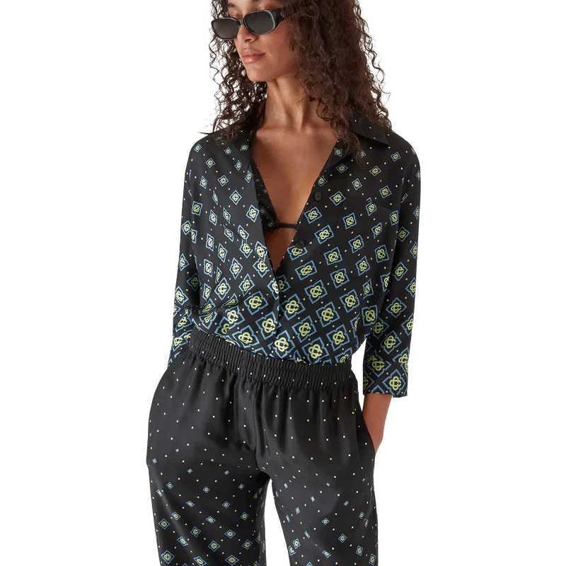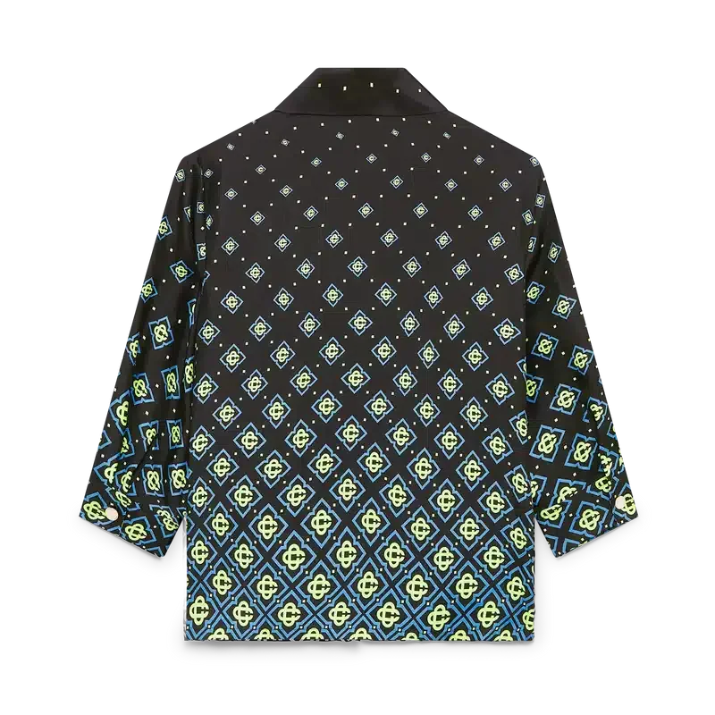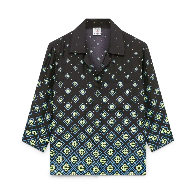 La camicia a maniche lunghe con monogramma sfumato presenta un design raffinato caratterizzato dal motivo monogramma nero iconico della Maison. È rifinita con colletto alla cubana, chiusura con bottoni, taschino sul petto, bottoni in corozo con logo CC intrecciato e bottoni smaltati con bordo dorato iconici della Maison sui polsini.<!–