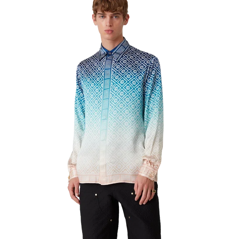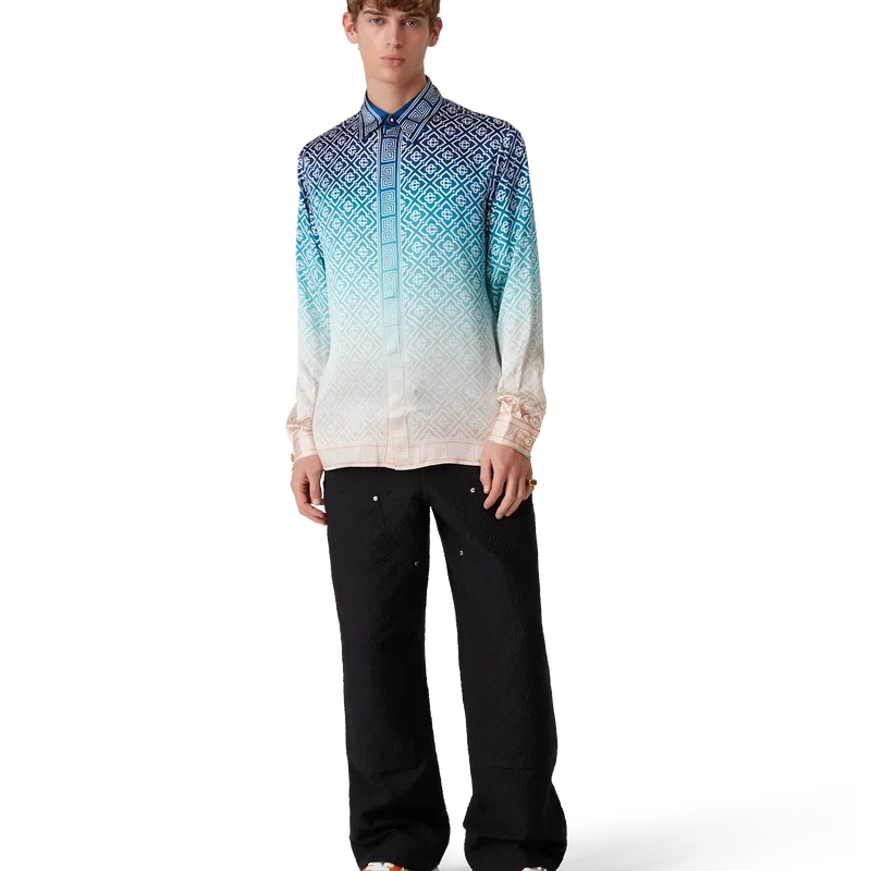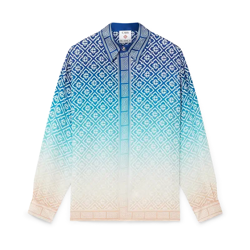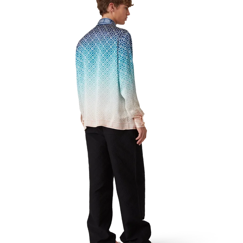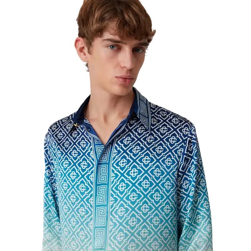 La camicia in seta jacquard sfumato è un modello a maniche lunghe con stampa all-over, realizzata in raso di seta con motivo Monogram sfumato. Rifinita con colletto, bottoni smaltati con bordo dorato su maniche e colletto, chiusura frontale con bottoni in corozo con marchio CC intrecciato e dettagli a motivo greco su colletto, polsini, abbottonatura e orlo.
