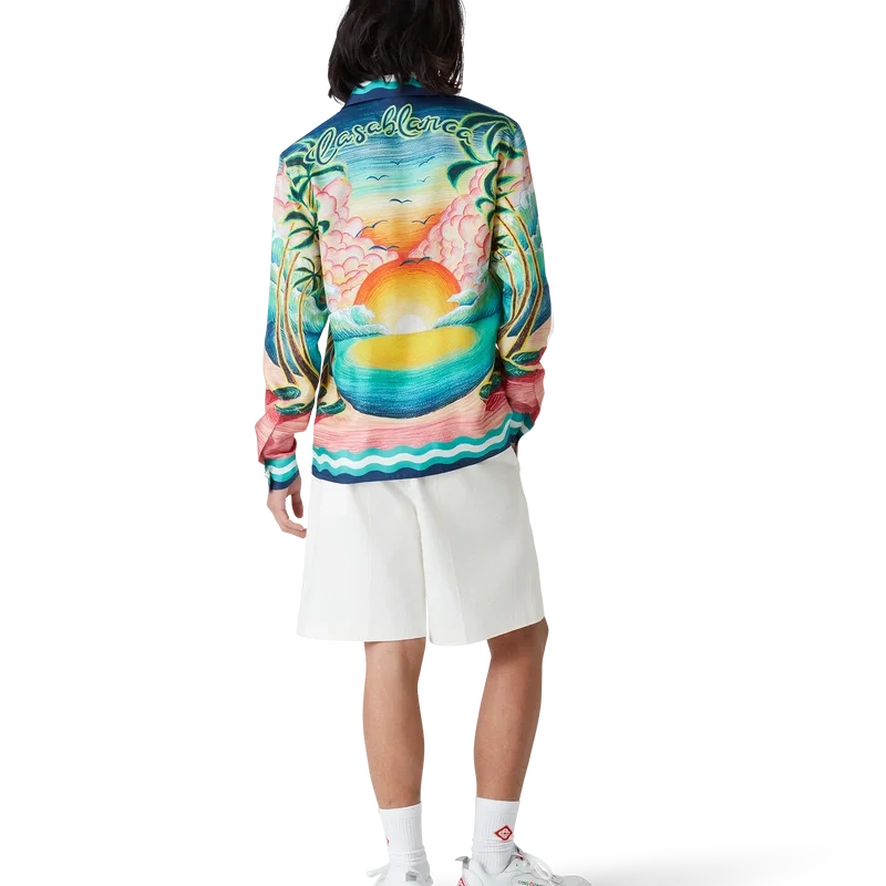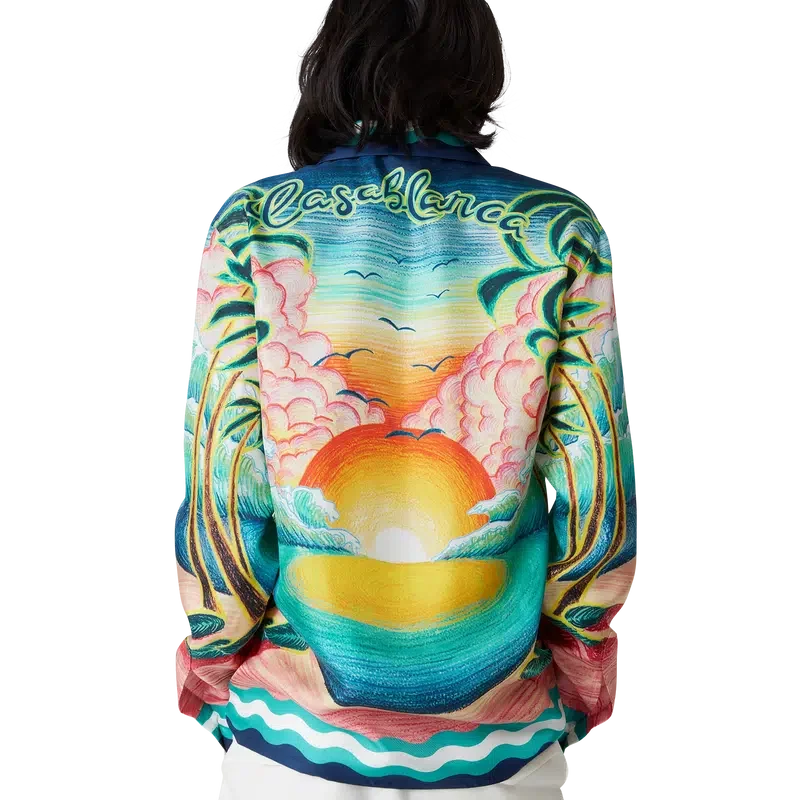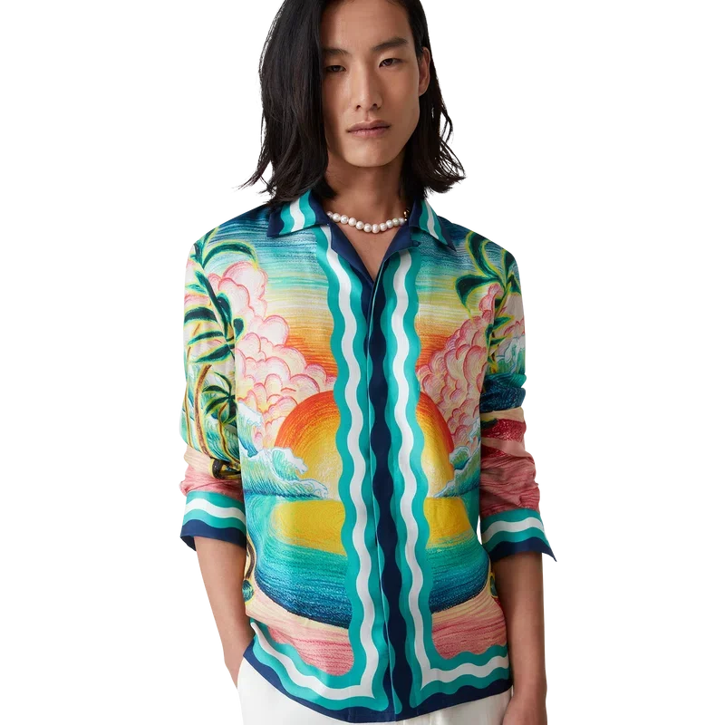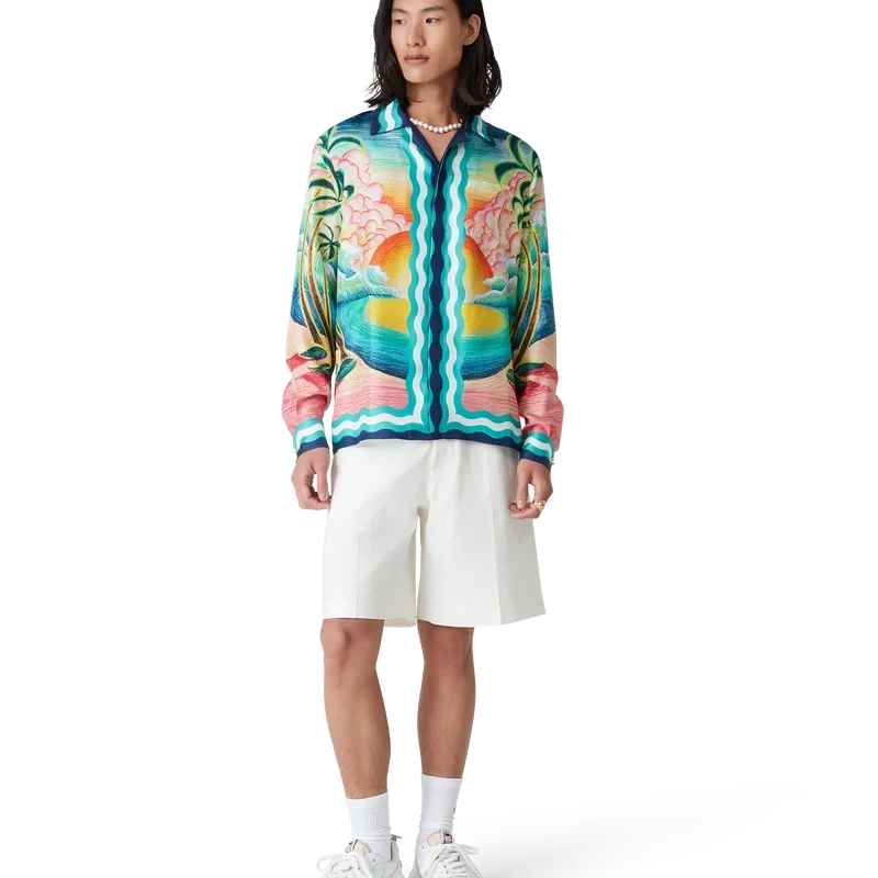 La camicia in seta Danse De La Mer è un modello a maniche lunghe con stampa all-over che presenta scene dipinte a mano create appositamente per la collezione e realizzate in tessuto di seta. Completata da chiusura con bottoni, bottoni in corozo con logo CC intrecciato, bottoni smaltati con bordo dorato e dettagli a strisce ispirati alle onde di Memphis su orlo, polsini, colletto e abbottonatura.