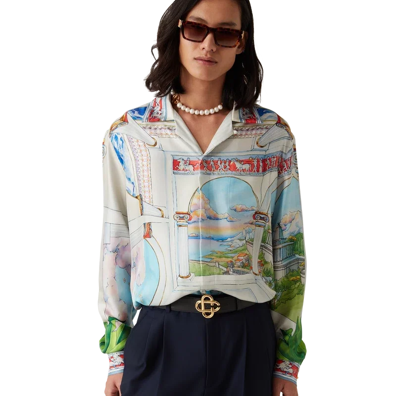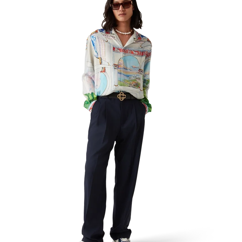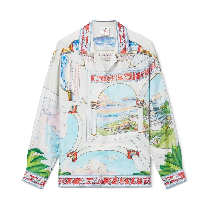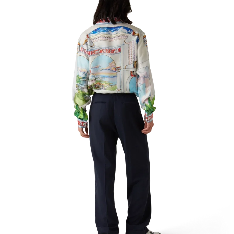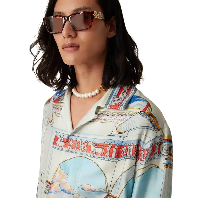 La camicia in seta Le Passage è un modello a maniche lunghe realizzato in twill di seta con la grafica stagionale della Maison, che presenta quattro diverse dimensioni giocando con le prospettive e l’architettura. Completa di colletto, chiusura con bottoni, bottoni in corozo con marchio Cc intrecciato, bottoni in madreperla con bordo dorato caratteristici sul colletto e sui polsini, dettaglio sul bordo ispirato al motivo a greca su colletto, polsini e orlo.