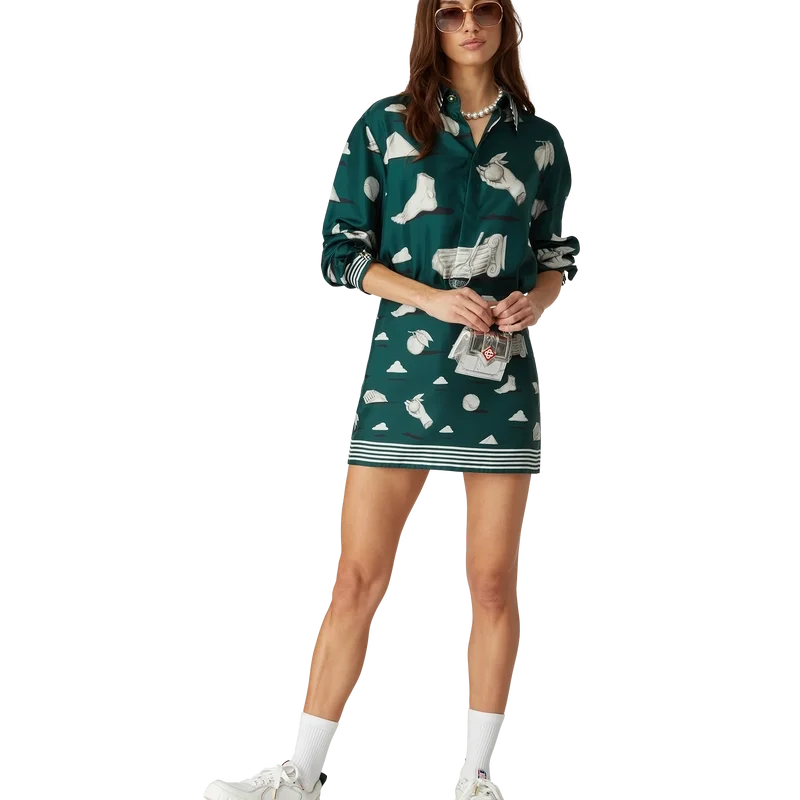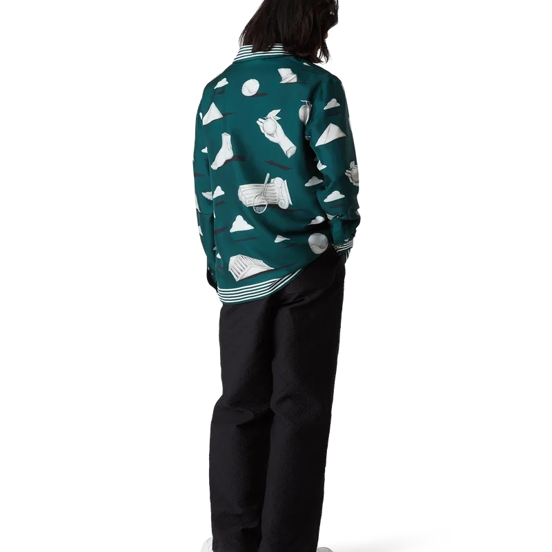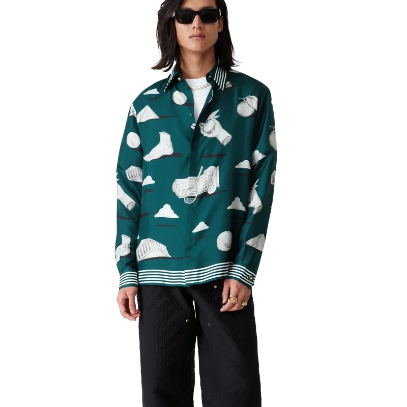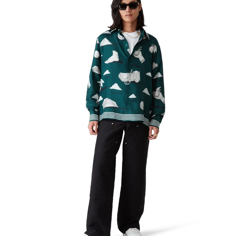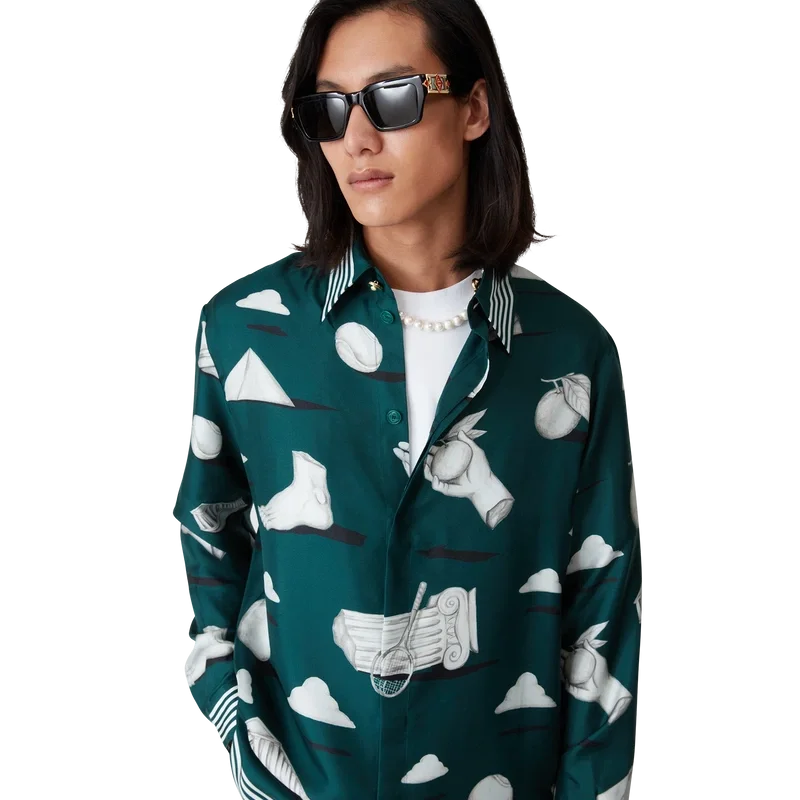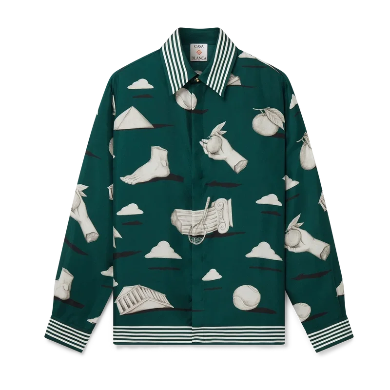 La camicia in seta Metaphysical presenta una stampa all-over, è realizzata in tessuto di twill di seta e presenta un disegno che raffigura gli elementi chiave del design. È rifinita con i caratteristici bottoni smaltati con bordo dorato sui polsini e sul colletto, chiusura frontale con bottoni in corozo CC intrecciati, colletto a lancia e dettagli a righe sul colletto, sui polsini e sull’orlo.