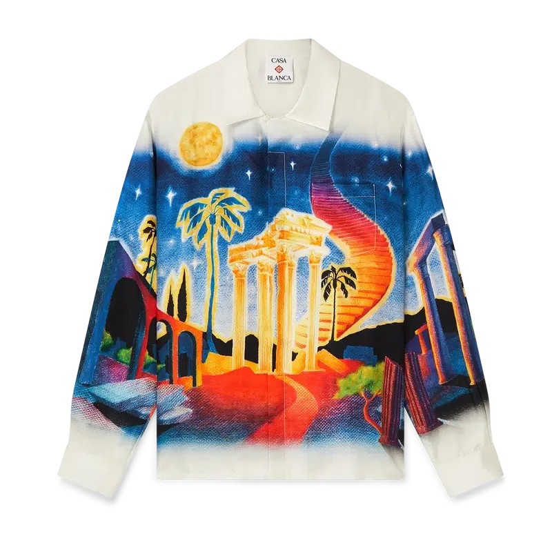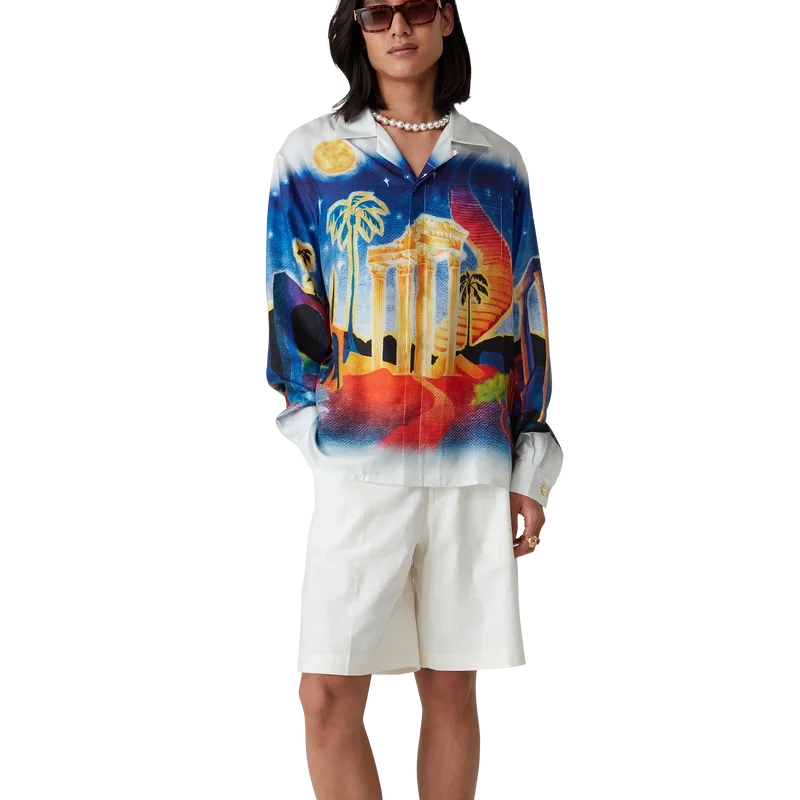 La camicia in seta Midnight Acropolis è un modello a maniche lunghe con stampa all-over, realizzata in twill di seta, che rende omaggio alla splendida notte dell’antica Grecia con la bellissima luce del tempio e del cielo. Completata da colletto cubano, bottoni smaltati con bordo dorato sulle maniche e chiusura frontale con bottoni in corozo intrecciati con il marchio Cc.