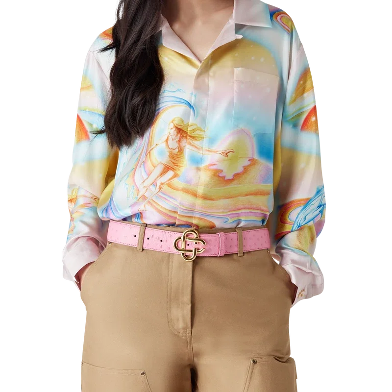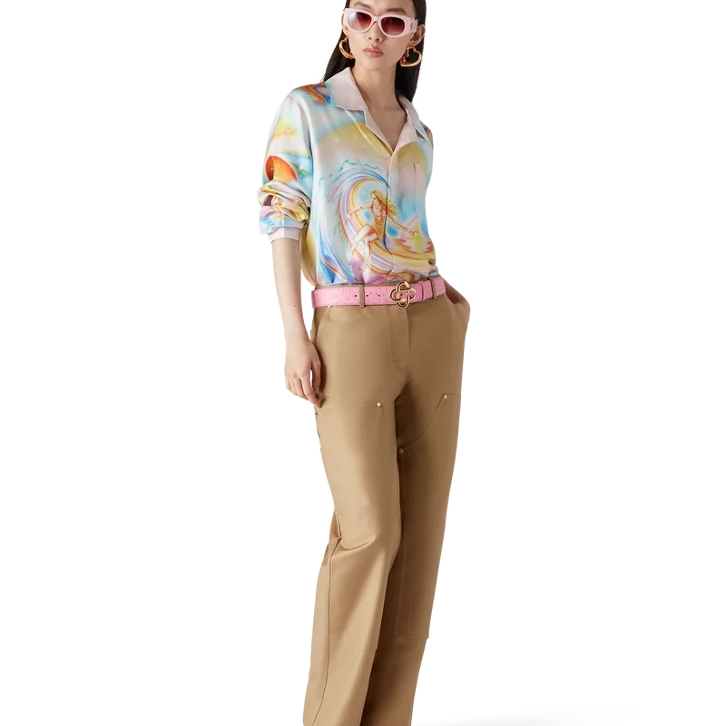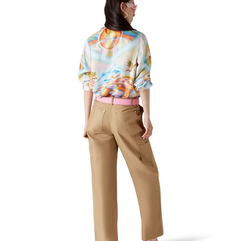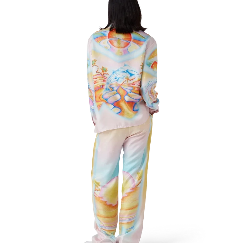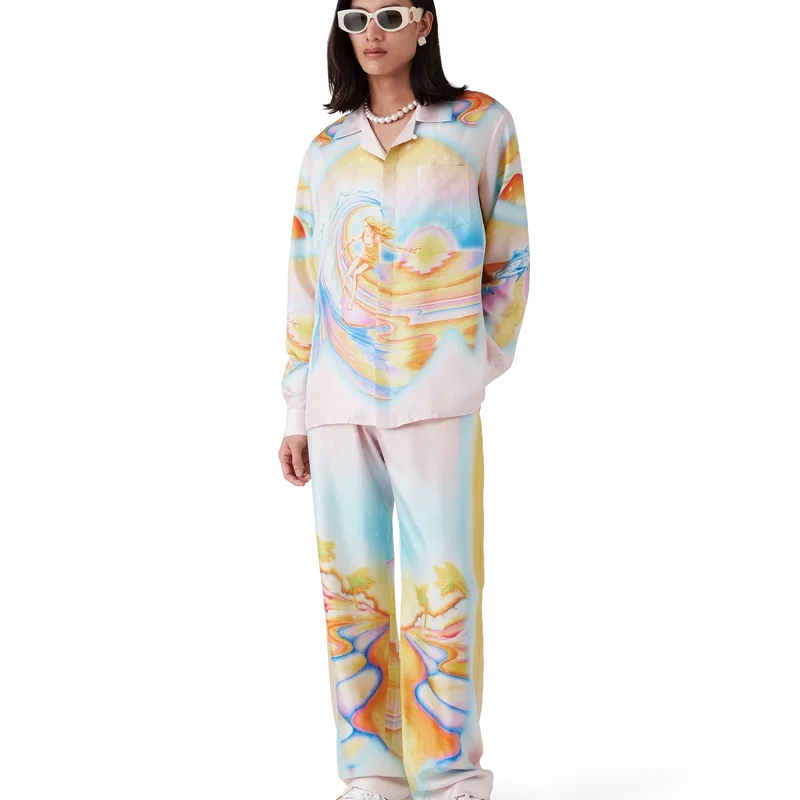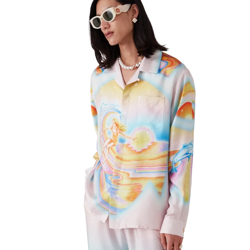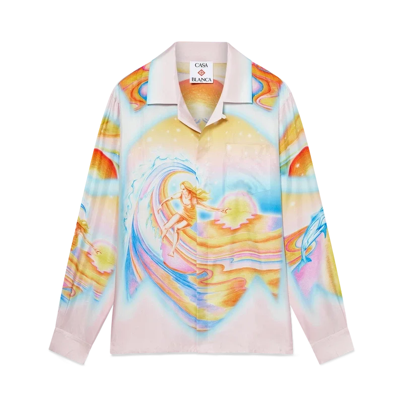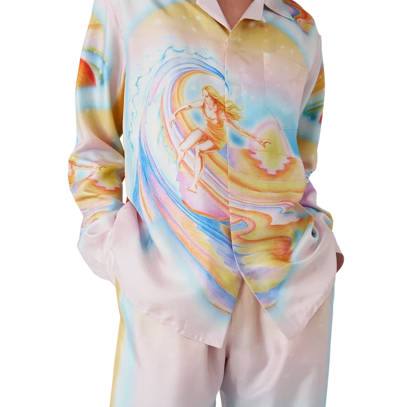 La camicia in seta Psychedelic Nirvana presenta una stampa all-over realizzata in twill di seta con motivi ispirati alle tavole da surf aerografate della California degli anni ’70, utilizzando colori pastello che conferiscono alla stampa un’atmosfera quasi onirica e idealistica. Rifinita con colletto cubano, taschino sul petto, chiusura con bottoni nascosti in corozo intrecciato e un bottone smaltato con bordo dorato su ciascun polsino.