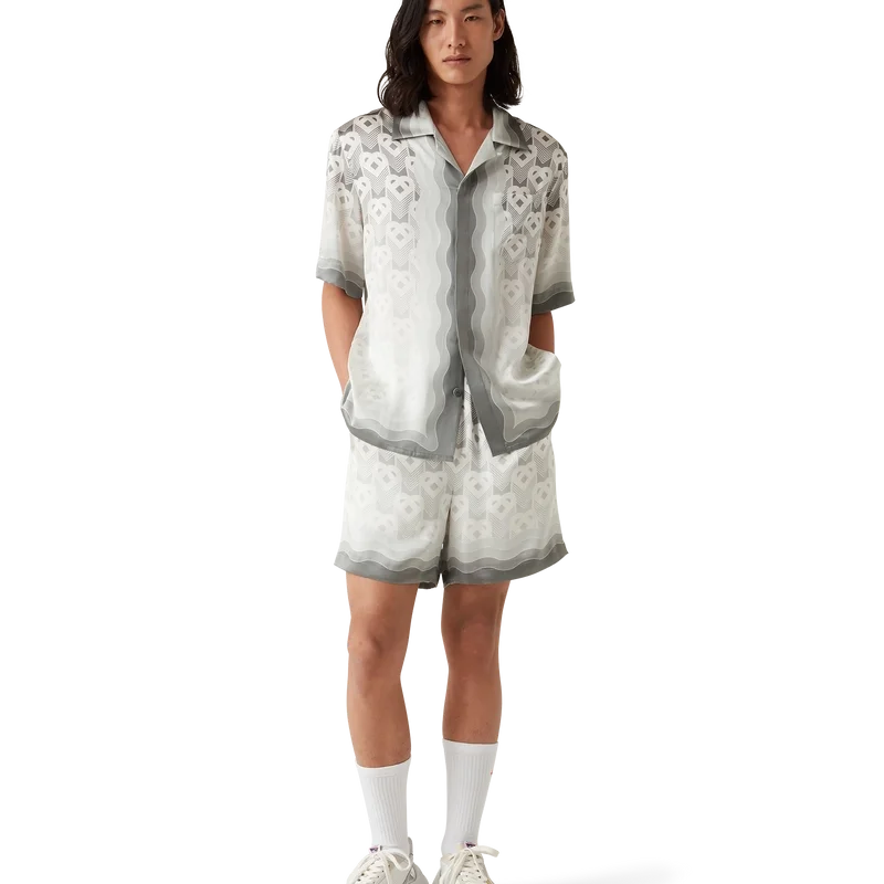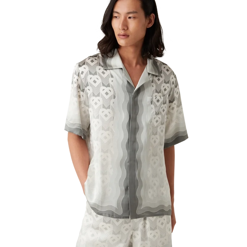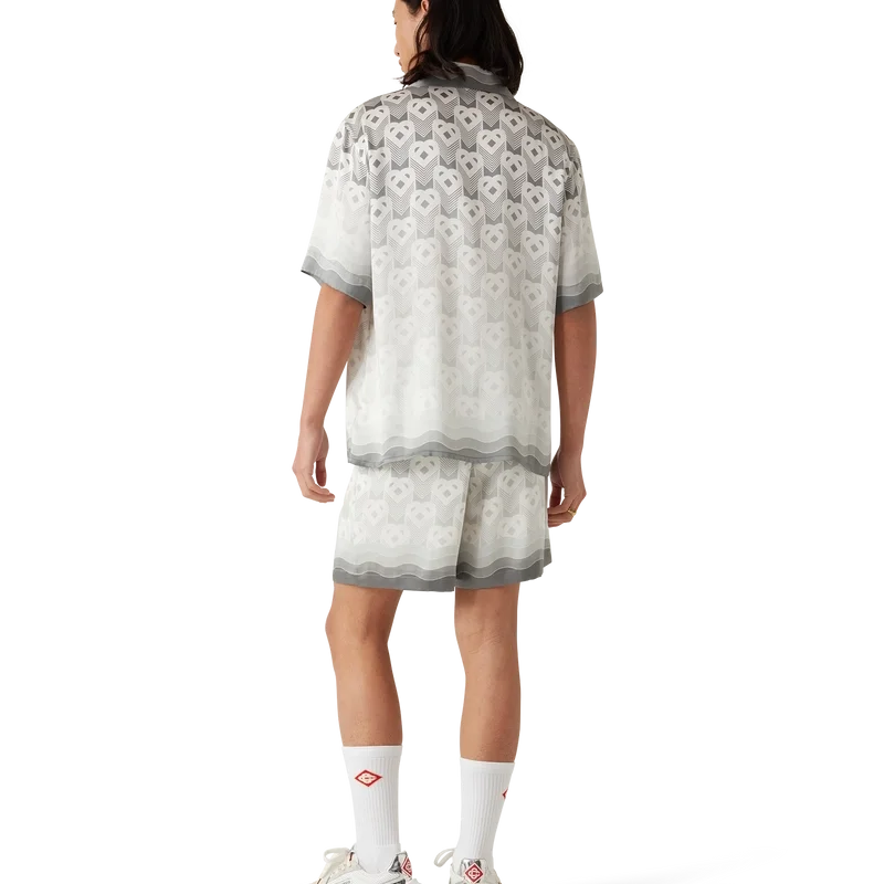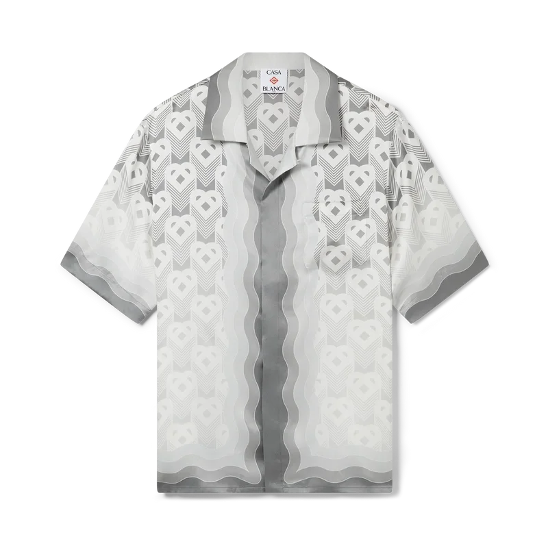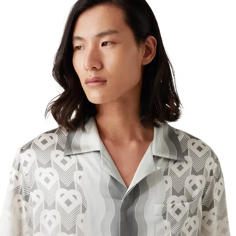 La camicia in seta con monogramma a cuori sfumati presenta una stampa all-over con il monogramma a cuori della Maison su uno sfondo argentato sfumato di questa stagione. Realizzata in raso di seta Monogram e rifinita con colletto, taschino sul petto, polsini, orlo e abbottonatura con dettagli sfumati ispirati alle onde di Memphis.