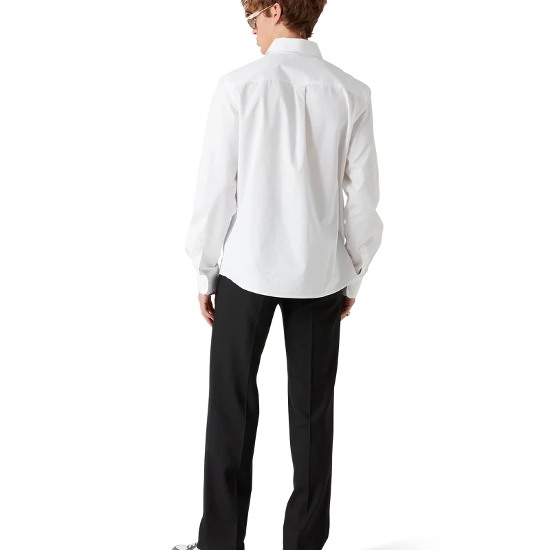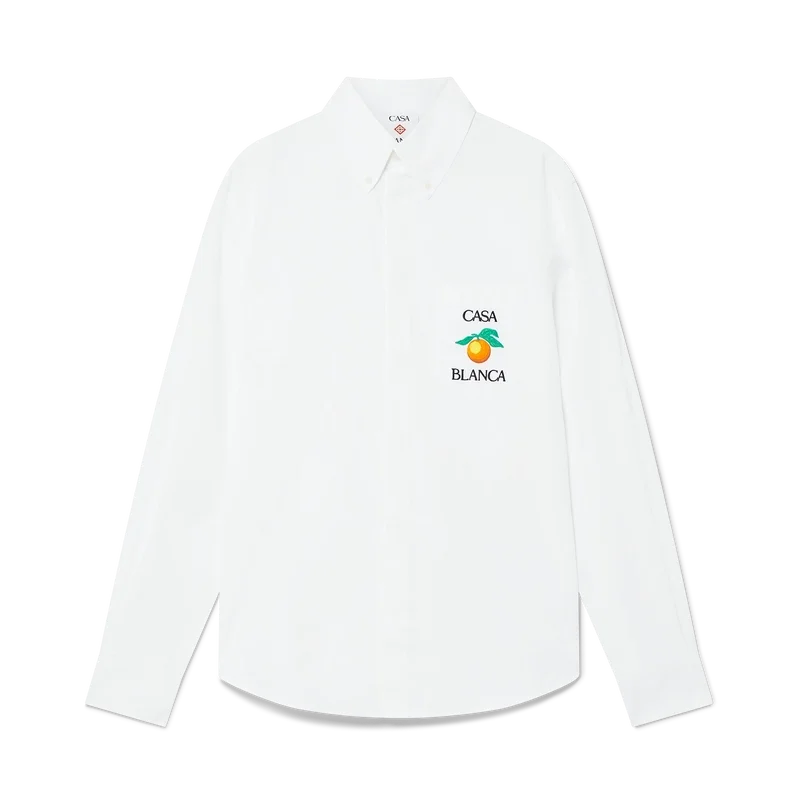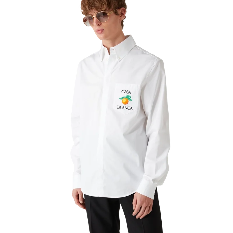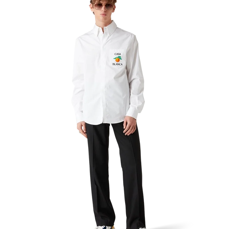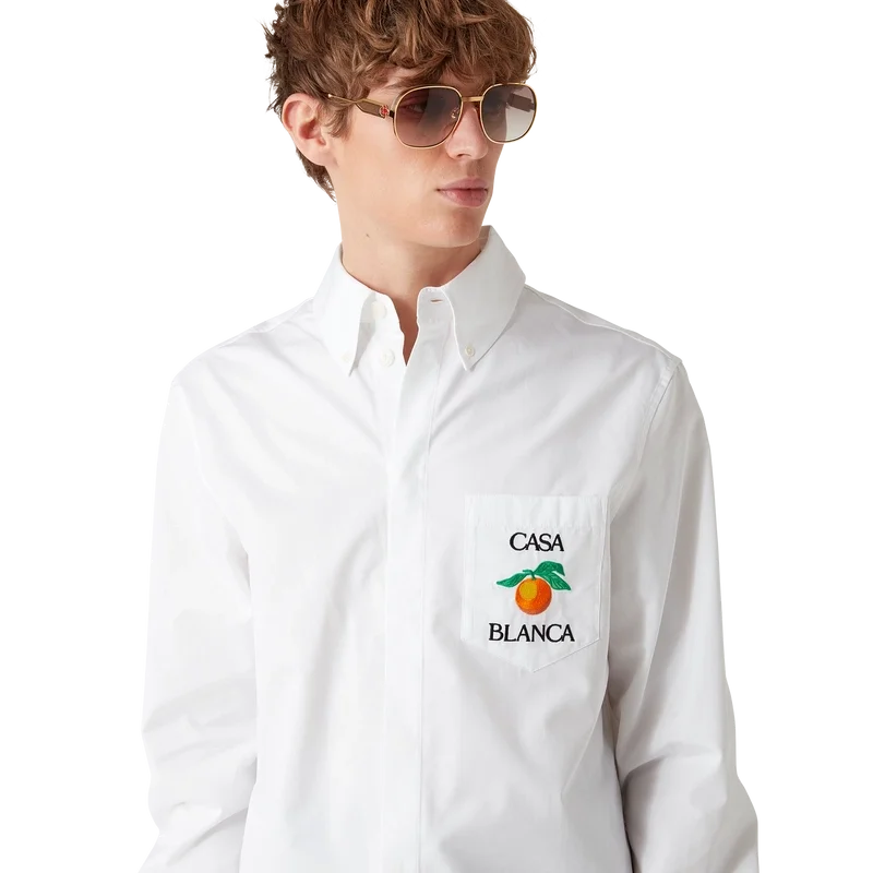 La camicia Oxford arancione ricamata è un modello a maniche lunghe, realizzata in tessuto di cotone e caratterizzata da un ricamo arancione – uno degli elementi di design della Maison – e dalla scritta Casablanca. Completata da un taschino sul petto, un colletto a punta abbottonato, chiusura frontale a bottoni nascosta e bottoni in corozo con logo Cc intrecciato.