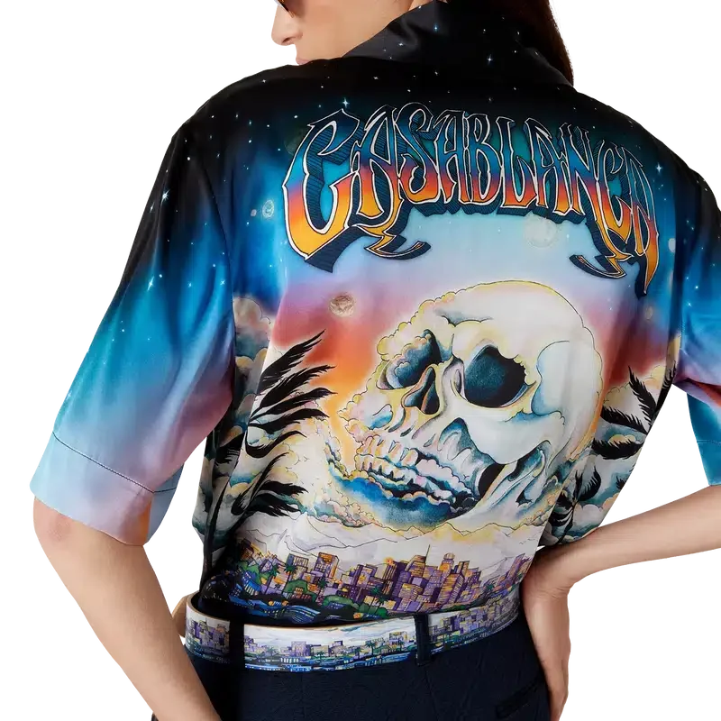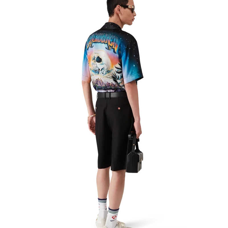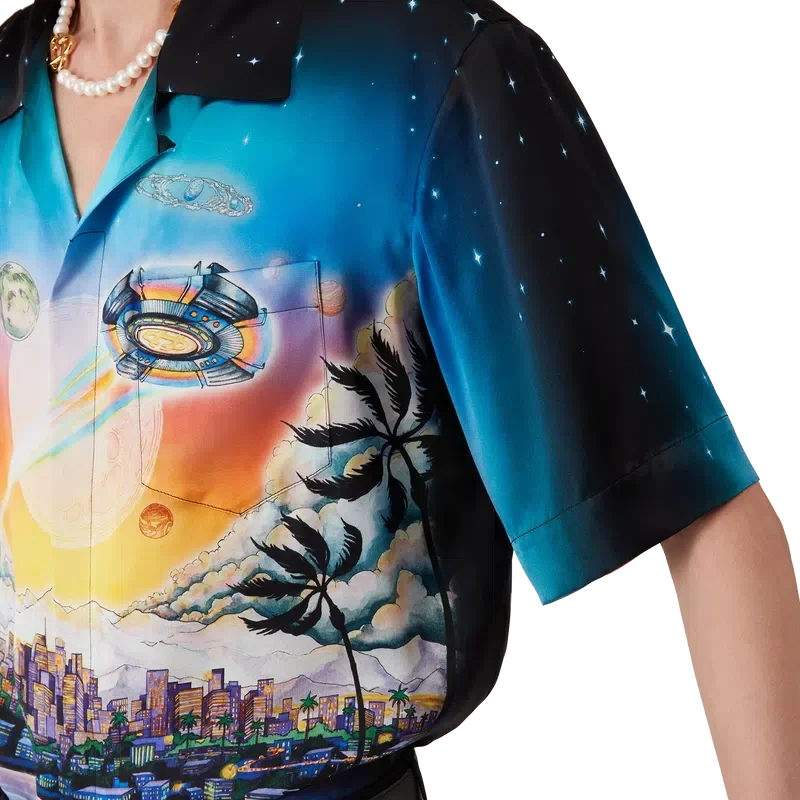 La camicia in seta La Pramonition è un modello a maniche corte realizzato in tessuto di raso di seta stampato con la grafica della stagione, ispirata a una visione inquietante dello skyline di Los Angeles di notte, con elementi UFO che richiamano l’ispirazione fantascientifica vintage. Completata da colletto cubano, taschino sul petto e chiusura con bottoni nascosti in corozo CC intrecciati.