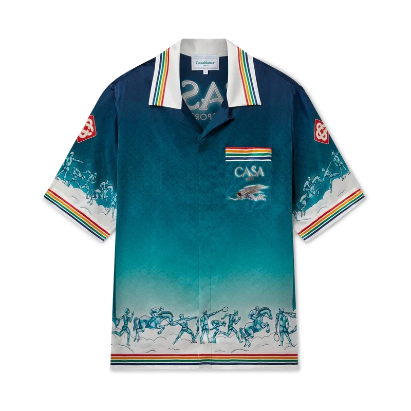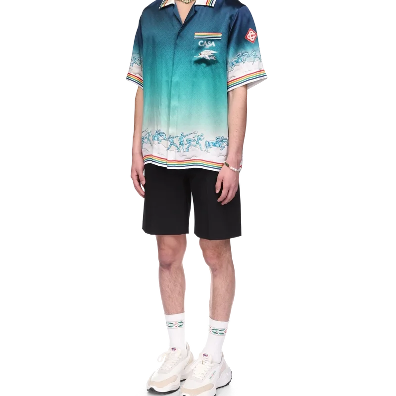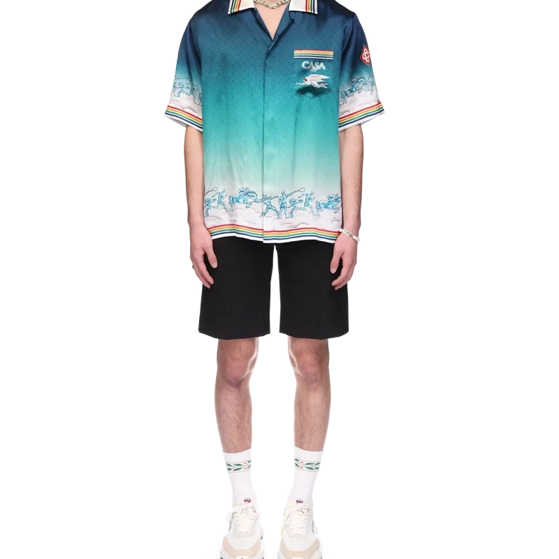 La camicia in seta La Deesse Du Stade è un modello a maniche corte stampato, realizzato in raso di seta con motivo monogramma sfumato che riproduce l’opera d’arte stagionale della Maison. Rifinita con colletto cubano, taschino sul petto, chiusura con bottoni, bottoni in corozo con logo CC intrecciato e dettagli a strisce multicolori su colletto, polsini, orlo e taschino.