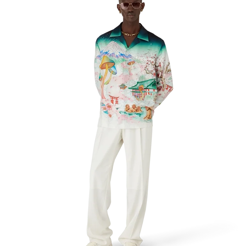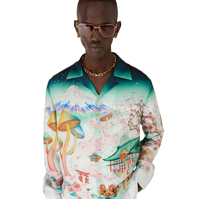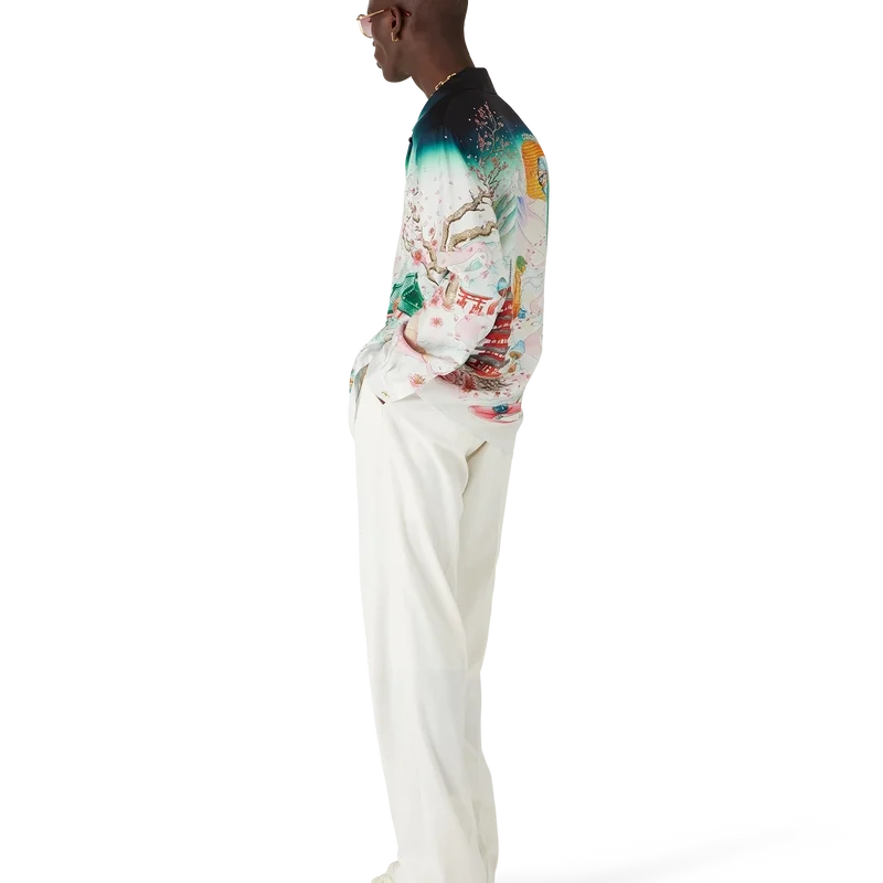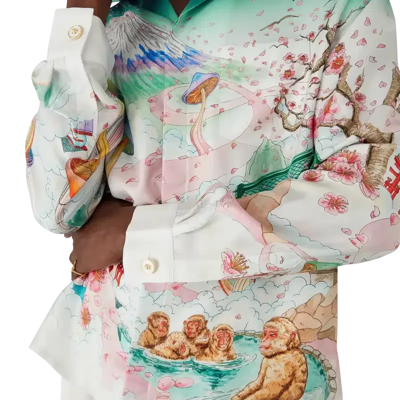 La camicia in twill di seta a maniche lunghe Flowers presenta una stampa all-over con motivi floreali di stagione: questa camicia racconta la storia di un viaggio attraverso i boschi del Giappone, alla scoperta della bellezza della natura lungo il percorso, simboleggiata dai fiori di ciliegio, dai funghi e dalle montagne. Il layout è simile alla nostra camicia greca “Eleusis in the Clouds”, che riprende lo stesso tema della ricerca della conoscenza. Completata da colletto cubano, chiusura con bottoni, bottoni in corozo con logo CC intrecciato, bottoni smaltati con bordo dorato ai polsini e taschino sul petto.
