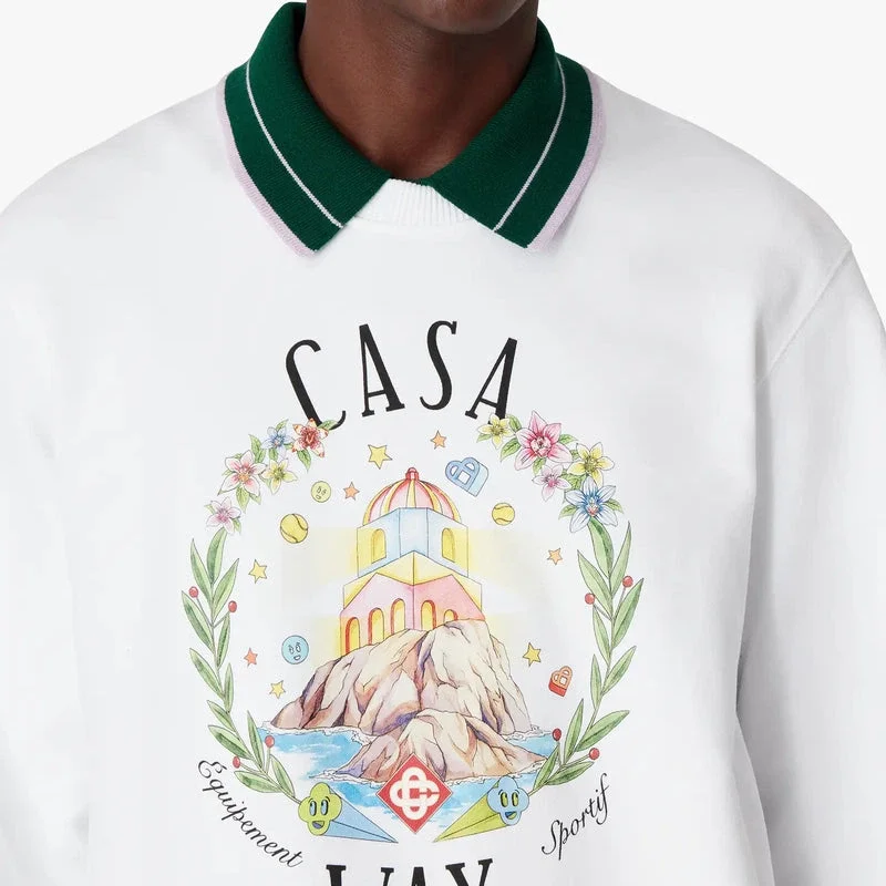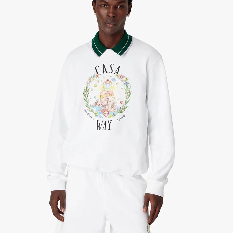 La felpa girocollo Casa Way è un raffinato modello a maniche lunghe, caratterizzato da una grafica che descrive la visione utopica di Ibiza come destinazione per un pellegrinaggio quasi religioso alla scoperta del suo variegato panorama musicale e come punto d’incontro e luogo di esperienze profonde. Completata da un classico girocollo e da polsini e orlo a costine.