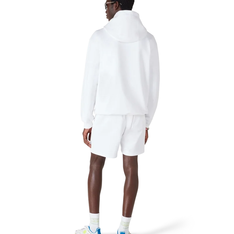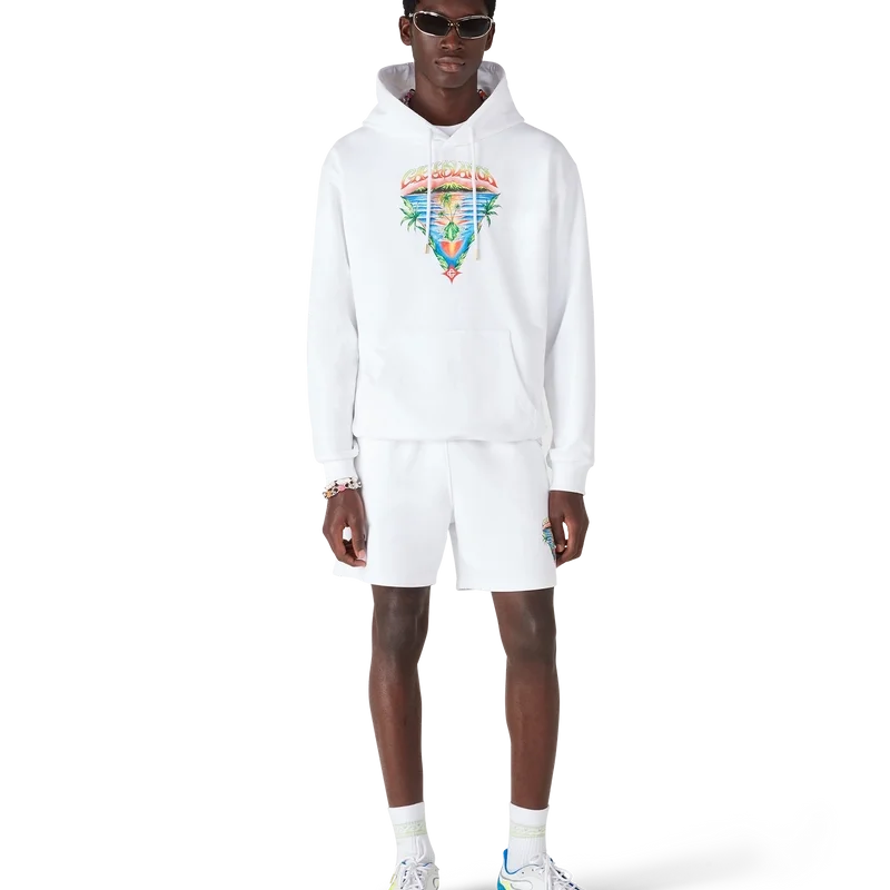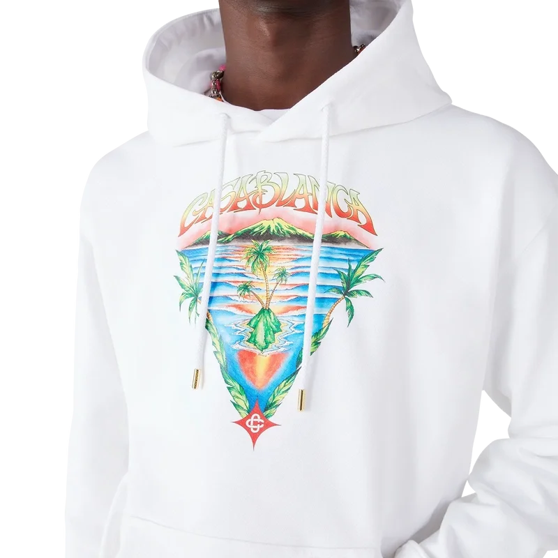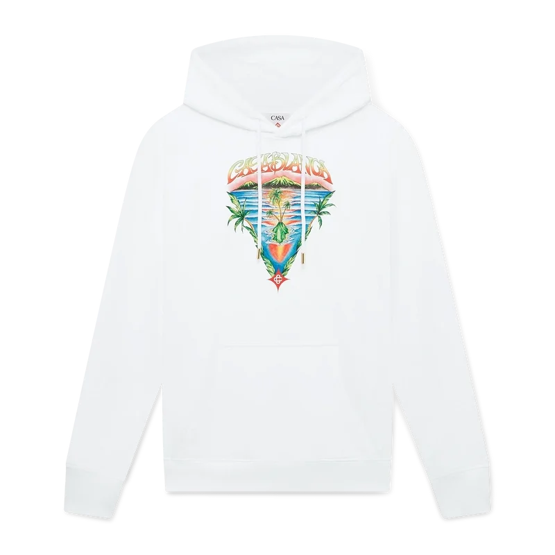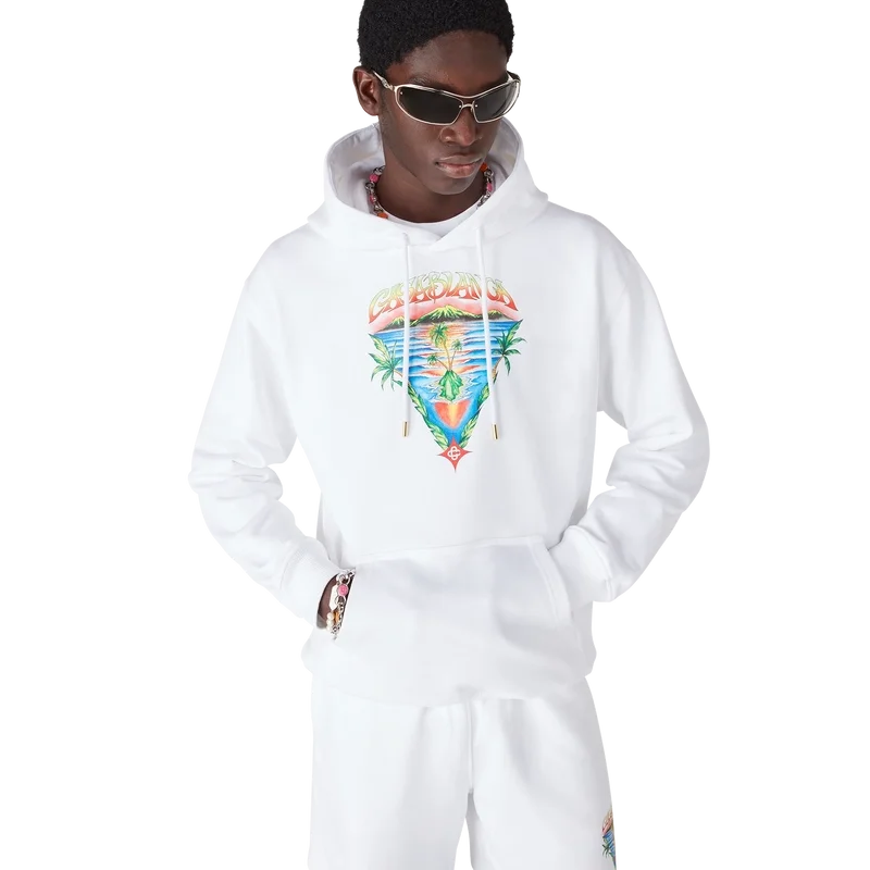 La felpa con cappuccio Innocence Triangle è un modello di lusso che raffigura una scena oceanica al tramonto con un’isola al centro, realizzata in uno stile influenzato dalla classica arte delle T-shirt da surf. L’opera d’arte cattura la bellezza eterea dell’ora d’oro sulle acque tropicali, presentando una visione idealizzata del paradiso balneare attraverso la raffinata lente sport-leisure della Maison.
