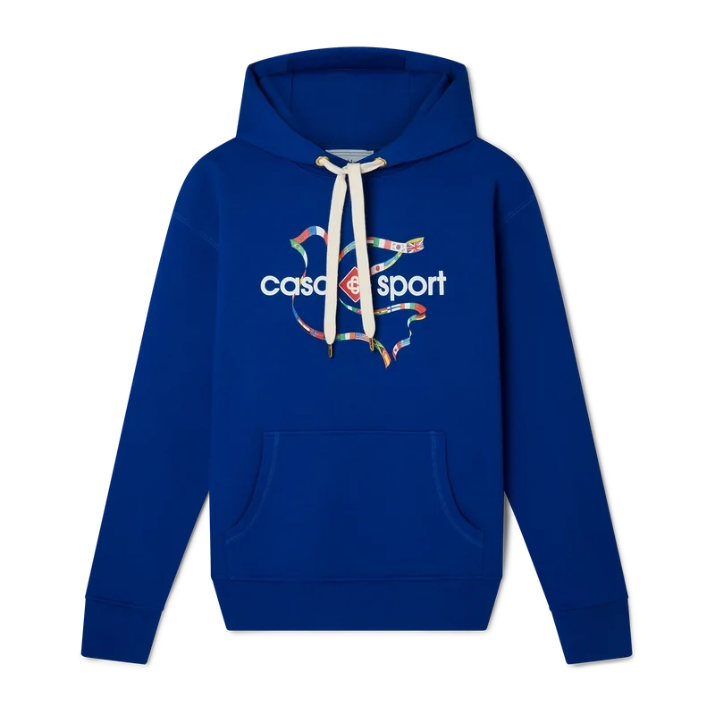 La felpa con cappuccio in cotone biologico serigrafata Drapeau De Collombes presenta una grafica stagionale che incorpora l’iconografia Casa Sport, segno distintivo della Maison. Caratterizzata da un classico girocollo, maniche lunghe ed etichetta con il marchio Casablanca Paris, è progettata per una vestibilità comoda.