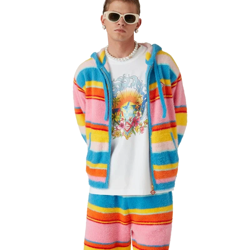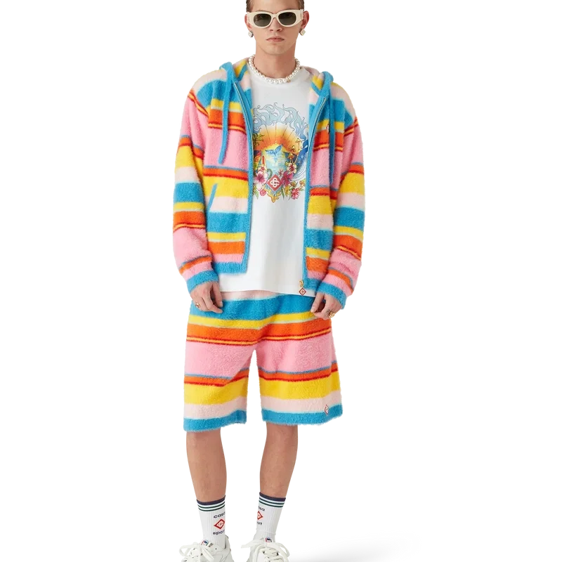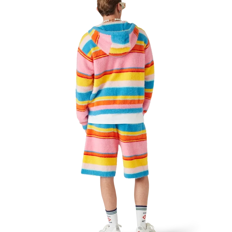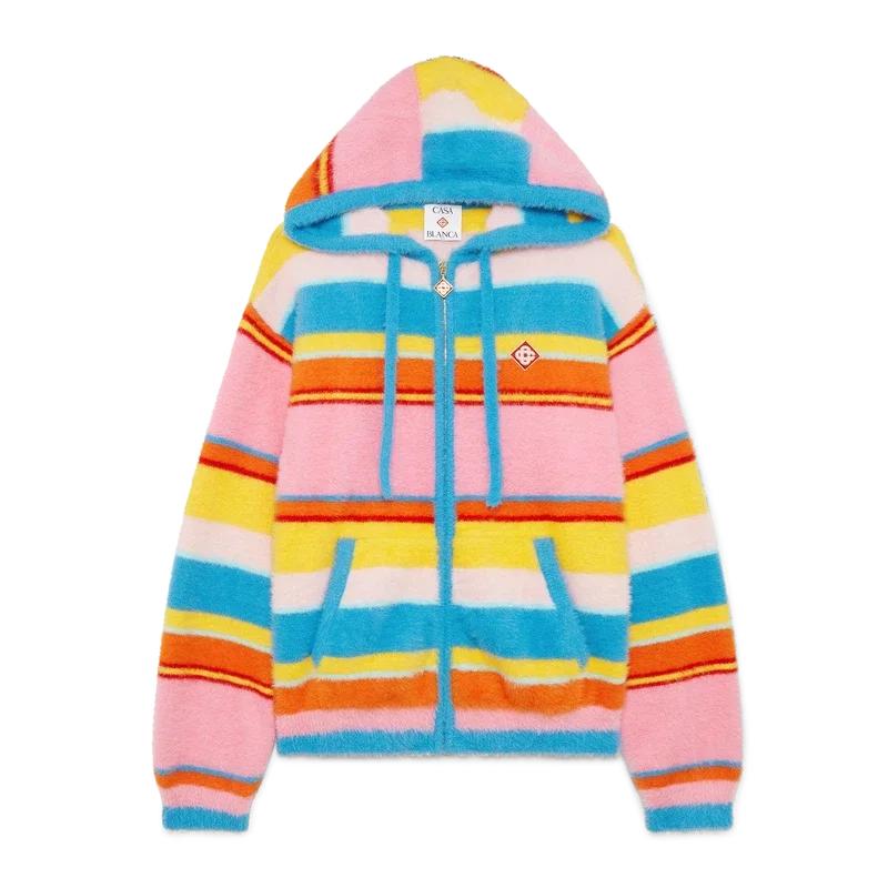 La felpa oversize con cappuccio a righe morbida è un modello di ispirazione sportiva realizzato in tessuto a maglia morbido a righe. Rifinita con il logo a diamante iconico della Maison, cappuccio, chiusura con zip, tasche applicate sul davanti e polsini e orlo elasticizzati.