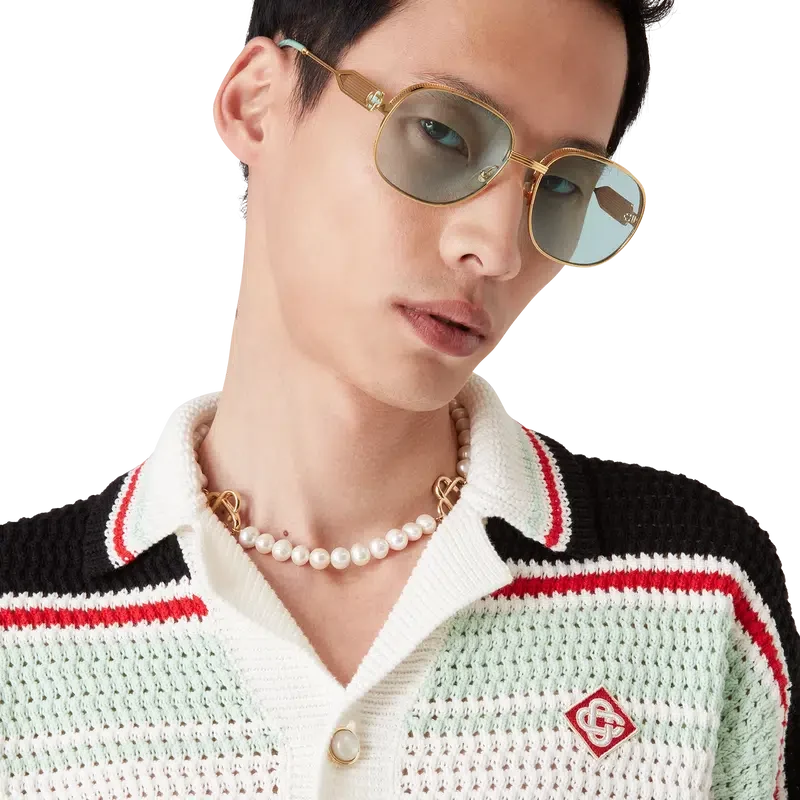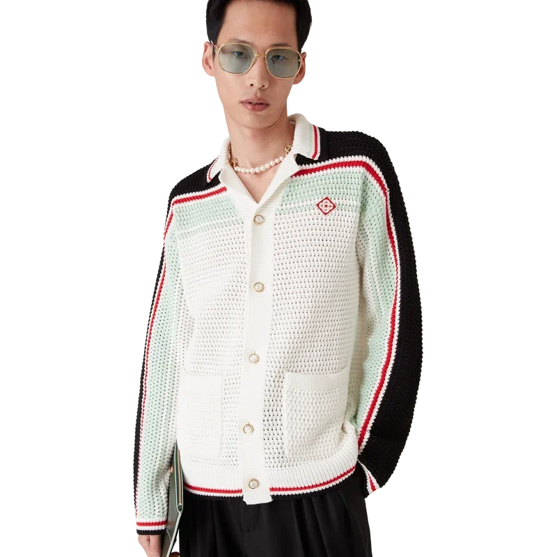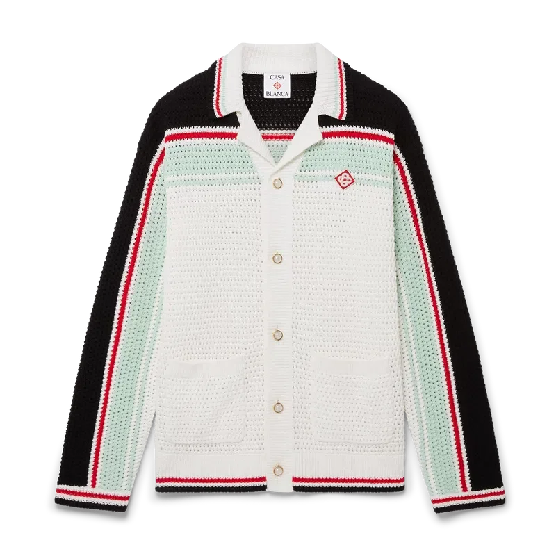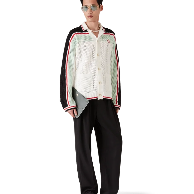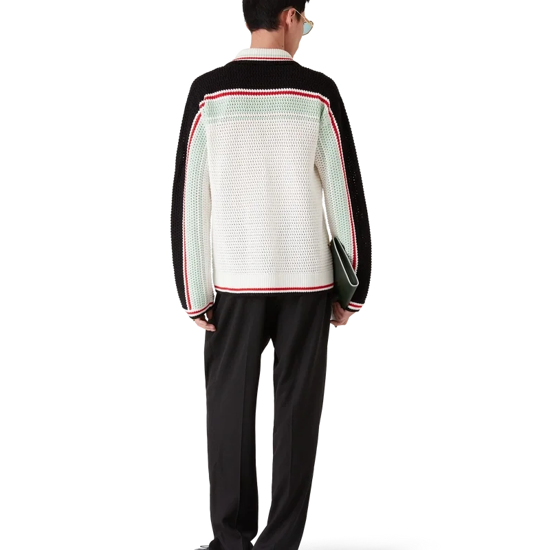 La giacca-pantalonetta in cotone all’uncinetto è un modello a maniche lunghe dalla trama particolare, realizzato in tessuto di cotone all’uncinetto e caratterizzato dal logo a rombi iconico della Maison, che richiama il tema del viaggio e delle vacanze della capsule collection. Completata da collo, polsini, orlo e abbottonatura a costine, tasche applicate sul davanti, chiusura con bottoni, bottoni in madreperla con bordo dorato caratteristici del marchio e dettagli a righe nere, rosse, menta e bianche sul petto, sulla schiena e lungo le maniche, oltre a bordi a righe su polsini, orlo e collo.