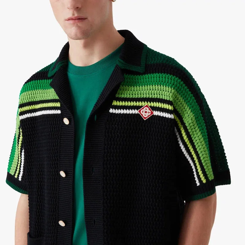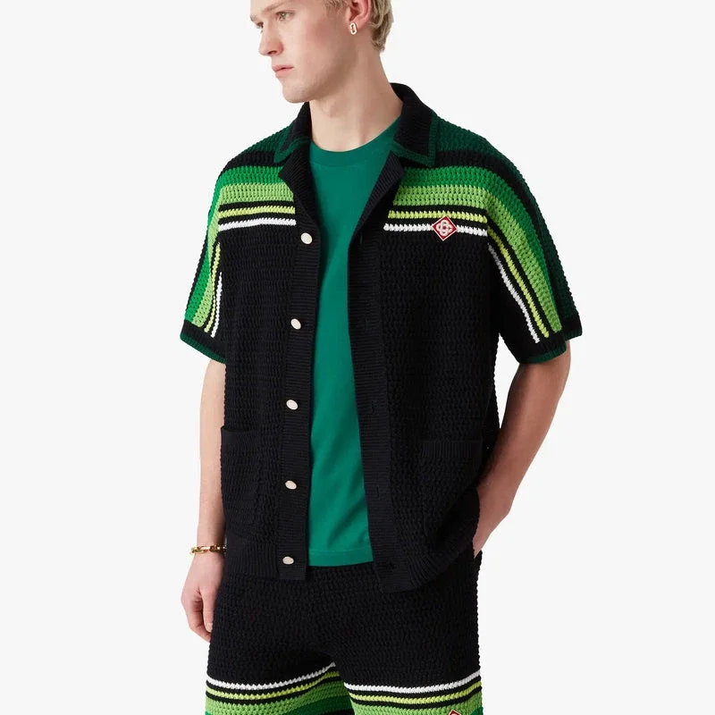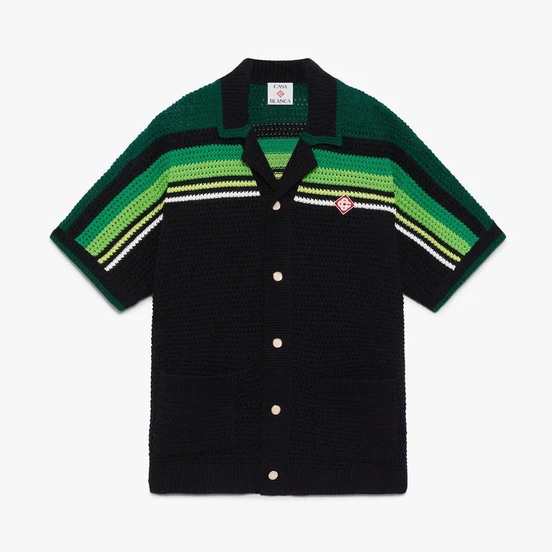 La camicia a maniche corte a righe nere e verdi presenta un raffinato design all’uncinetto con il caratteristico logo a diamante della Maison e dettagli a righe verdi e lime su spalle, petto e maniche. Completata da collo, polsini e orlo a costine, chiusura frontale con bottoni, tasche applicate sul davanti e caratteristici bottoni in madreperla con bordo dorato.