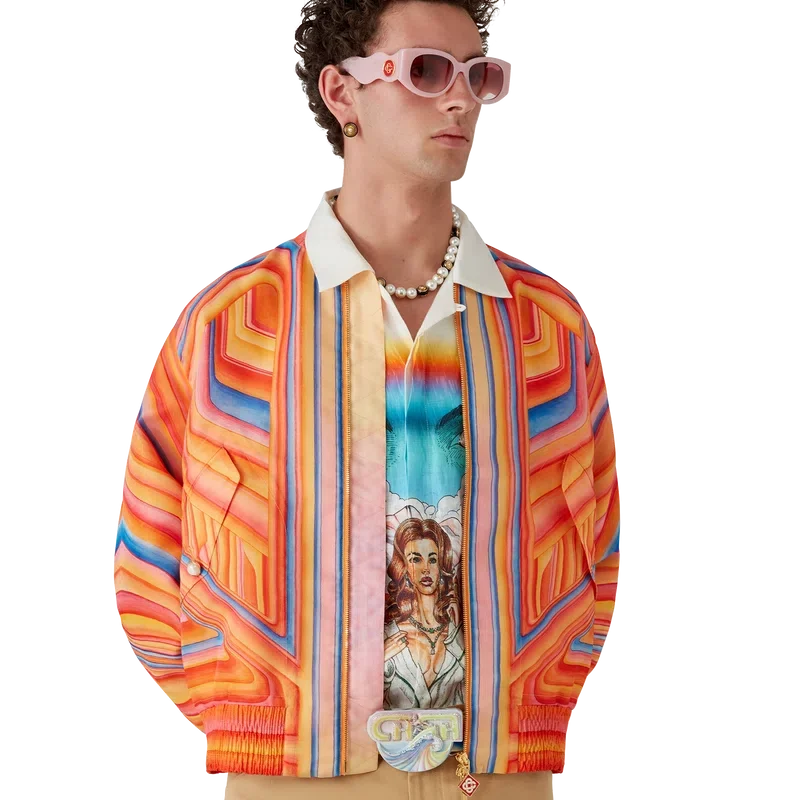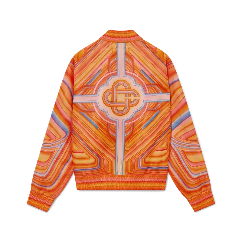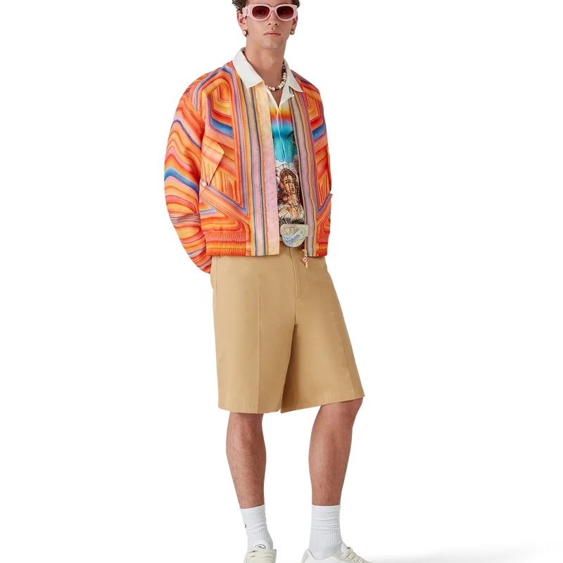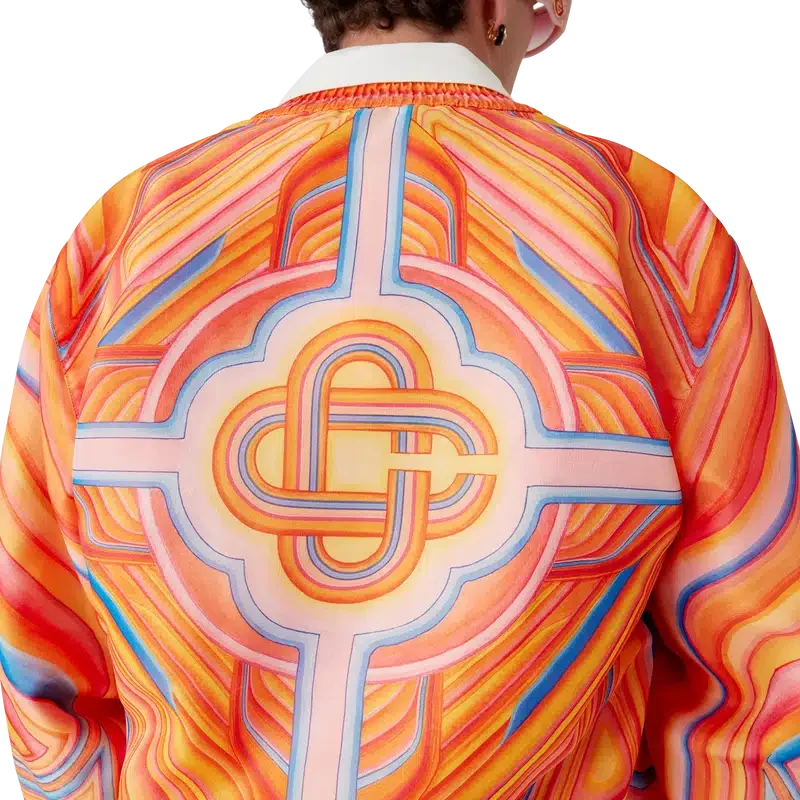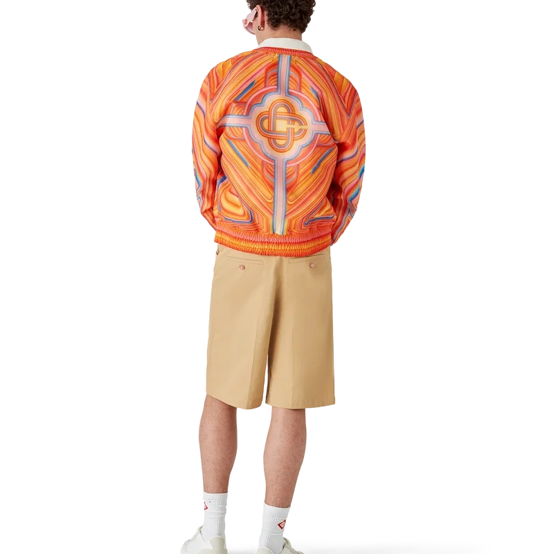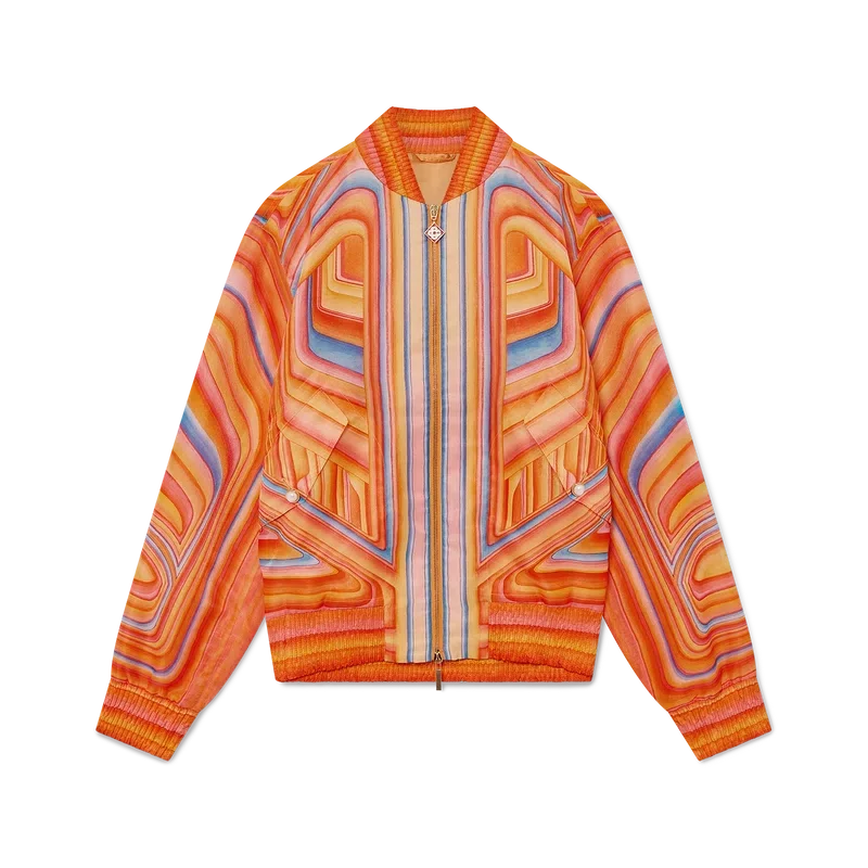 La giacca bomber Low Rider in organza presenta un design stampato con una silhouette classica, realizzata in tessuto tecnico con la grafica Low Rider della stagione. Completata da chiusura con zip con il logo a diamante della maison sulla linguetta, tasche frontali con patta e chiusura con bottoni in oro con bordo perlato, e collo, polsini e orlo a costine.