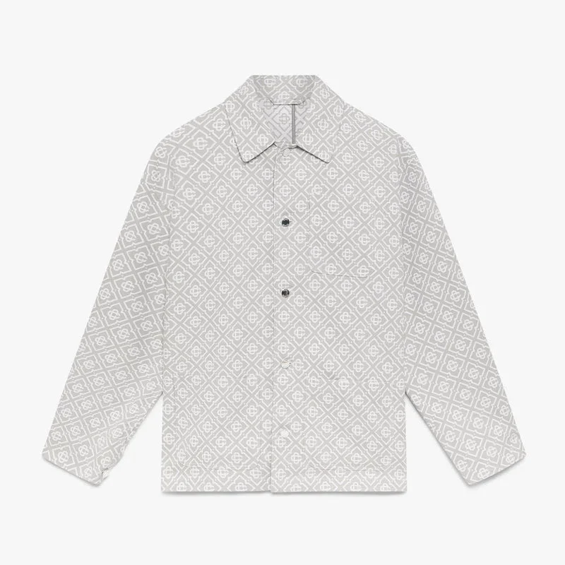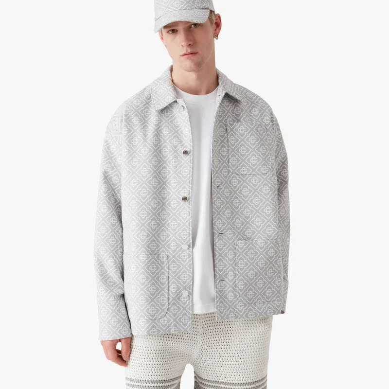 La giacca da lavoro grigia con monogramma è un modello a maniche lunghe dalla vestibilità comoda e dal design raffinato e disinvolto, caratterizzato dal motivo Monogram della Maison su tutta la superficie. Rifinita con colletto, chiusura con bottoni, tasca sul petto, tasche applicate sul davanti e dettagli metallici placcati argento.