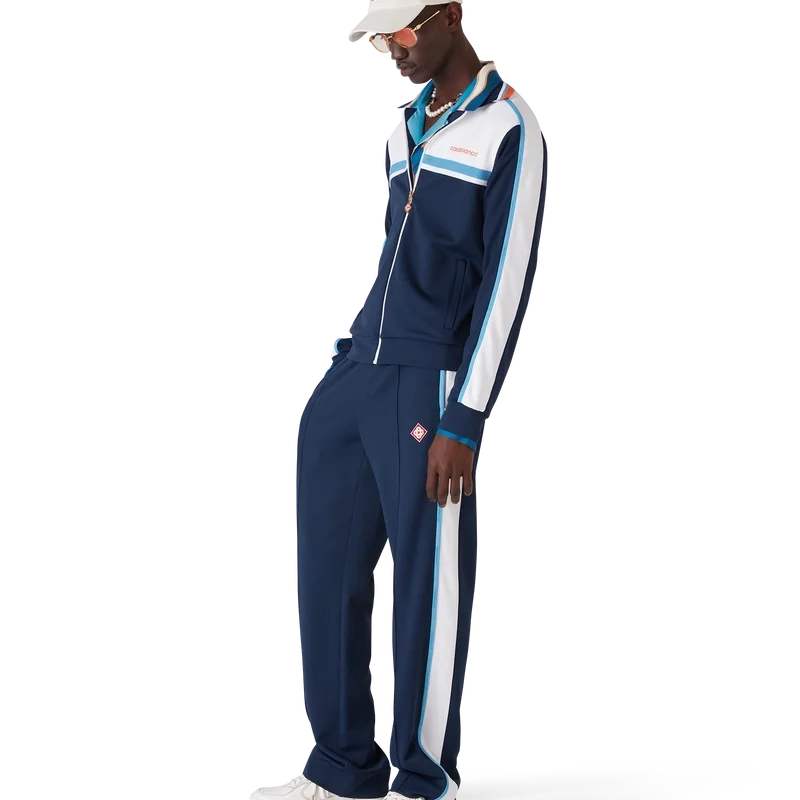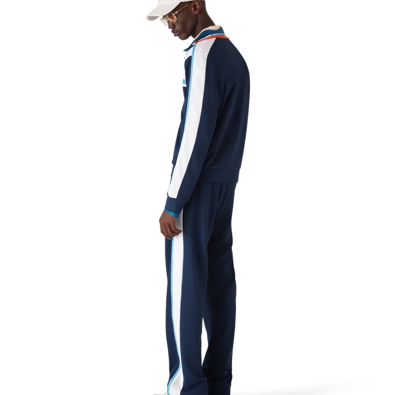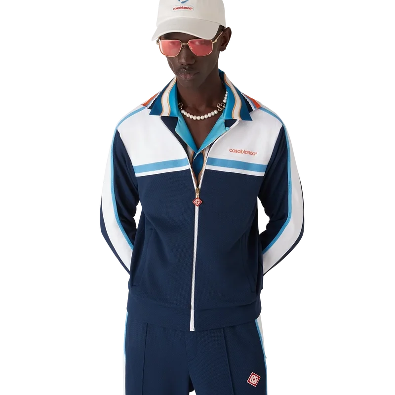 La giacca da tuta in piqué è un classico capo sportivo realizzato in tessuto piqué a trama rotonda. Rifinita con collo a costine, blocchi di colore blu navy e bianco, dettaglio a strisce sul petto, chiusura con zip, polsini e orlo a costine e fodera in rete.