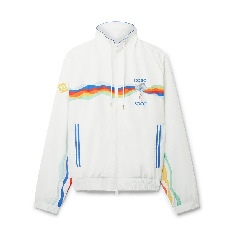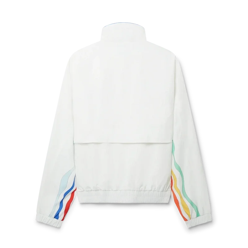 Lo stile sportivo di lusso assume un fascino retrò con la nostra giacca da tuta Mind Vibrations Wave Shell in poliestere bianco. Questo capo di capispalla sportivo incorpora la nostra grafica Mind Vibrations, tema chiave della collezione Primavera/Estate 2023, con una silhouette classica da giacca da tuta, zip frontale, tasche laterali e cordini con puntali dorati. Qui è abbinata a pantaloncini da tuta coordinati.