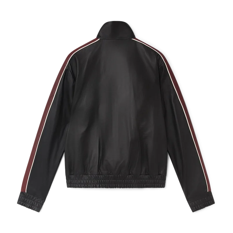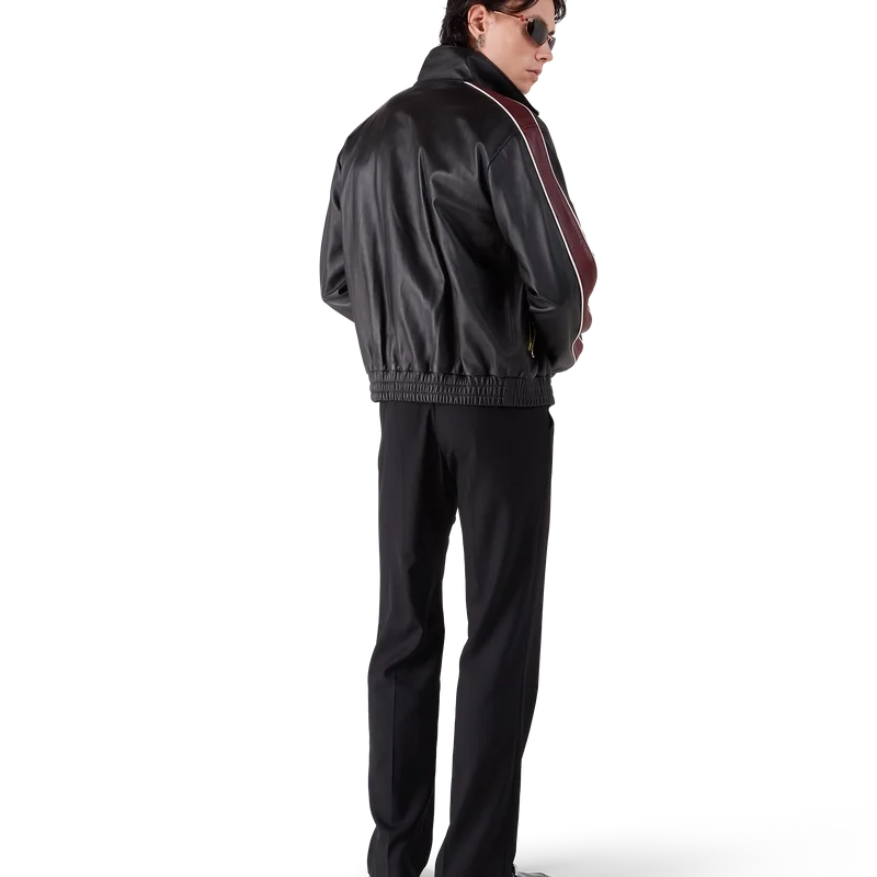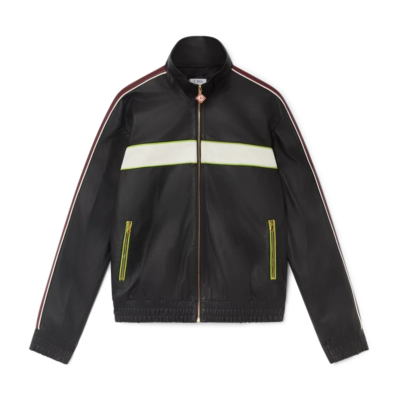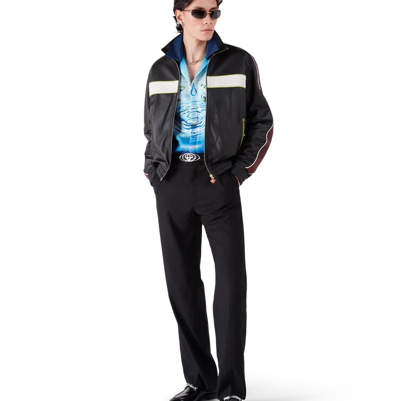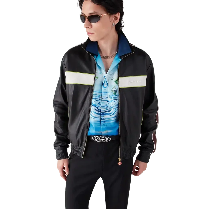 La giacca in pelle nera è un modello raffinato realizzato in morbida pelle di agnello nappa, con il caratteristico logo Casablanca della Maison sul petto. Completata da collo alto, chiusura con zip con il logo a diamante della Maison, fodera, logo CC intrecciato della Maison impresso sulla manica, tasche verticali con bordino a contrasto e chiusura con zip, striscia a contrasto e dettagli con bordino sulle spalle, lungo le maniche e sul petto, e polsini e orlo elasticizzati.