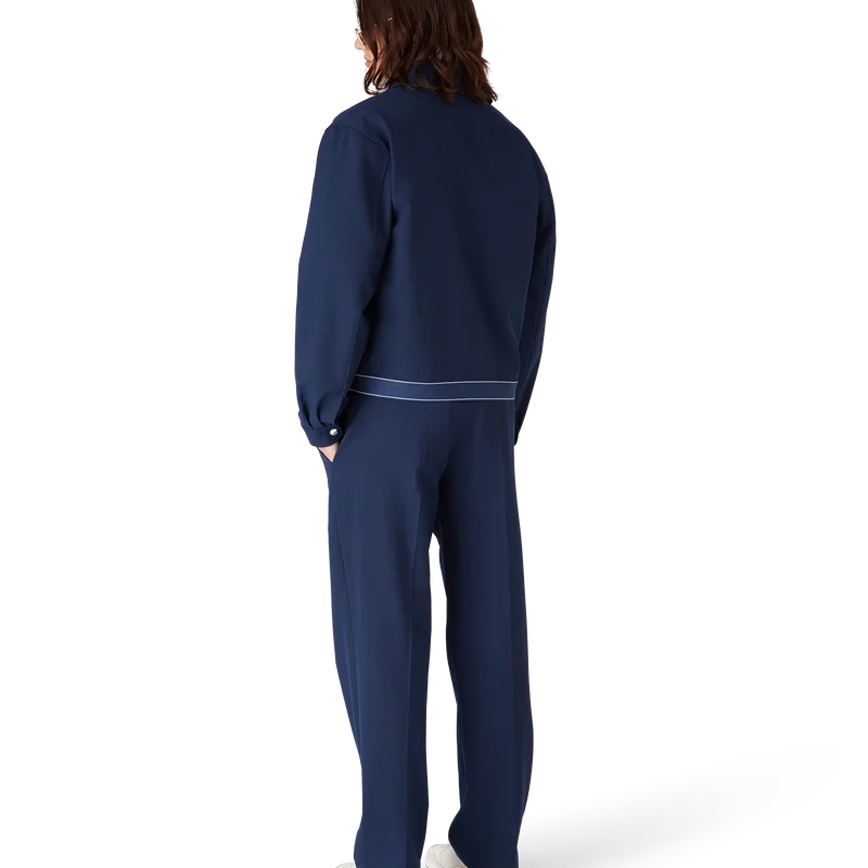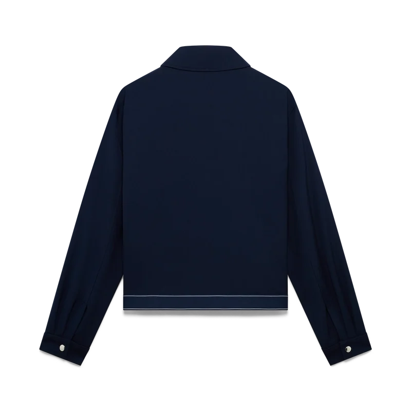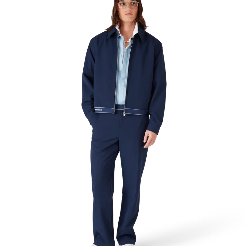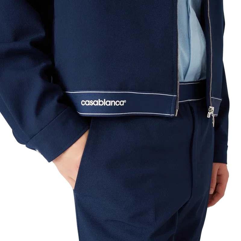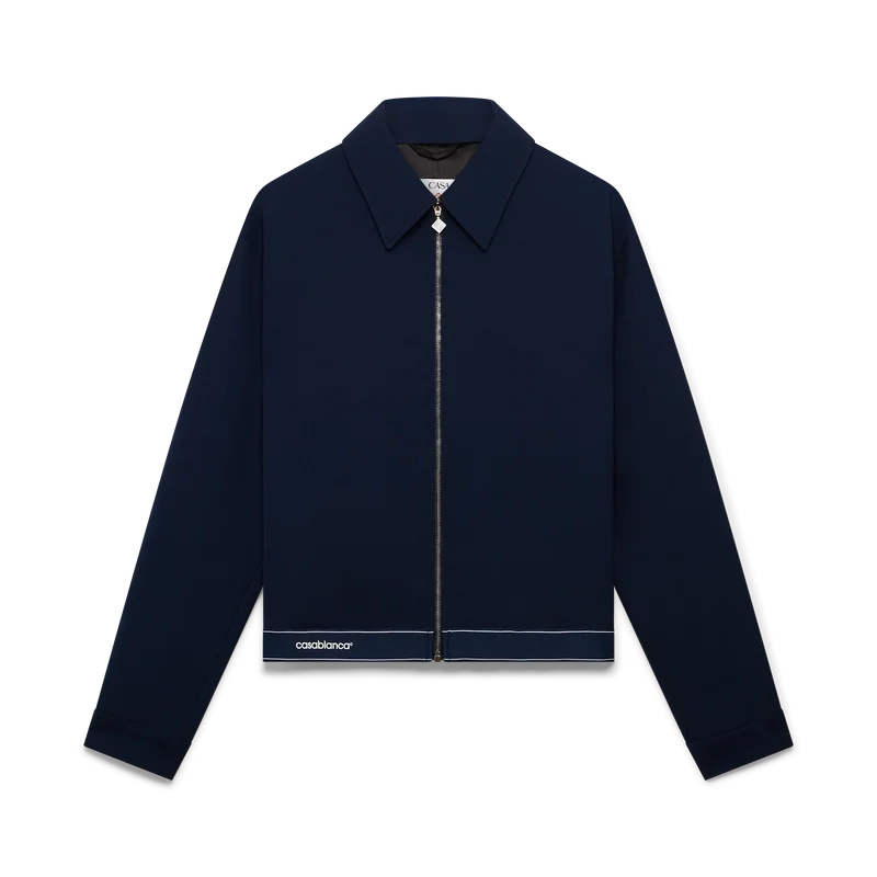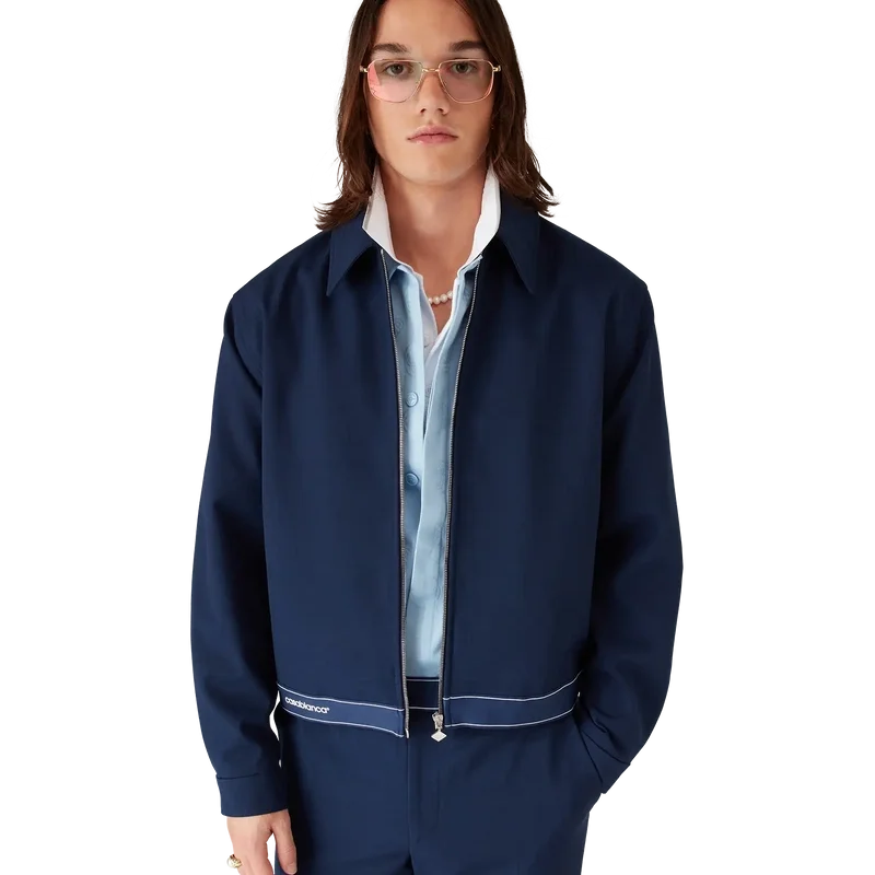 La giacca sportiva in lana blu navy è un modello raffinato realizzato in tessuto misto lana, che riflette la sensibilità sportiva e casual della Maison. Completata da colletto a punta, chiusura frontale con zip con linguetta con il caratteristico logo a diamante, fodera, dettagli metallici placcati in oro con marchio e orlo con nastro che riporta il logo Casablanca della Maison con bordi a strisce.