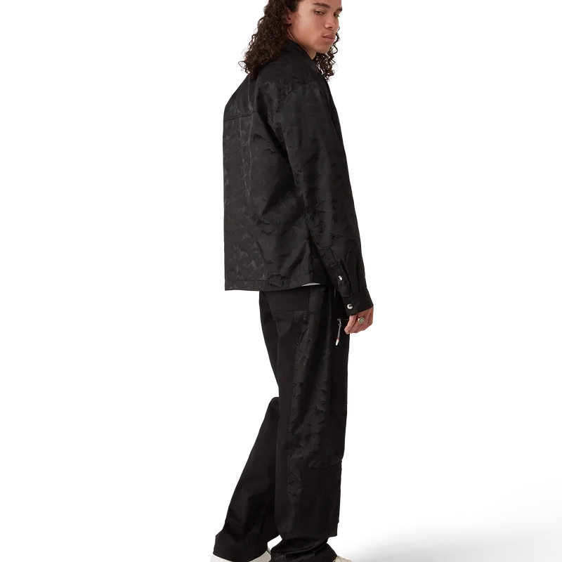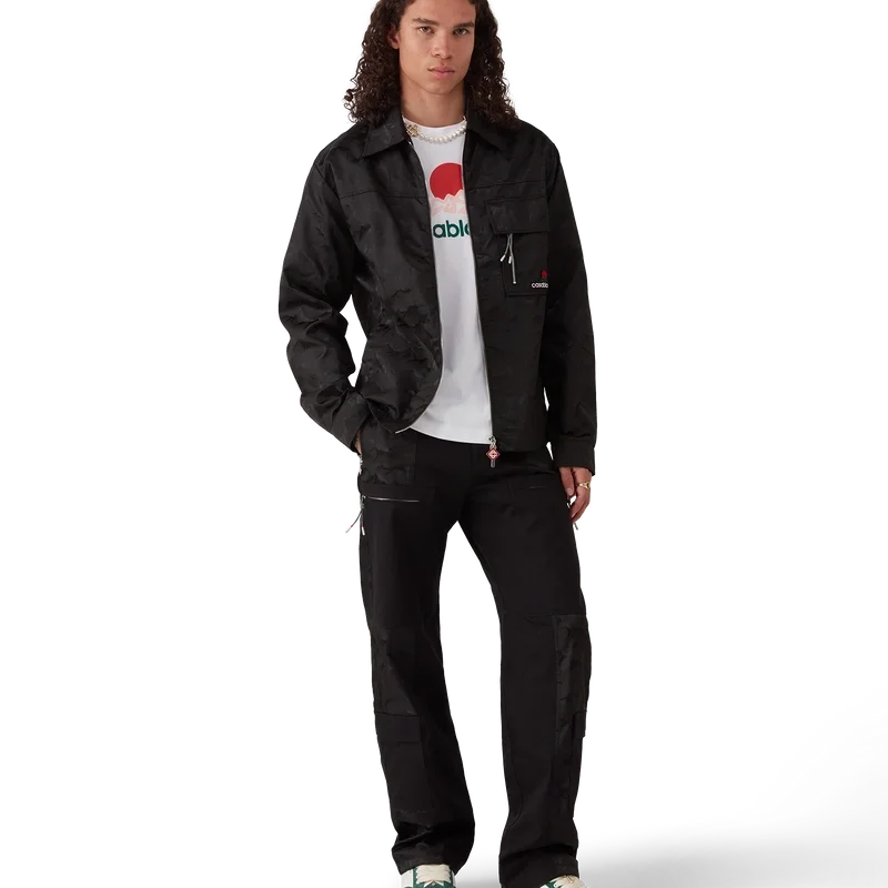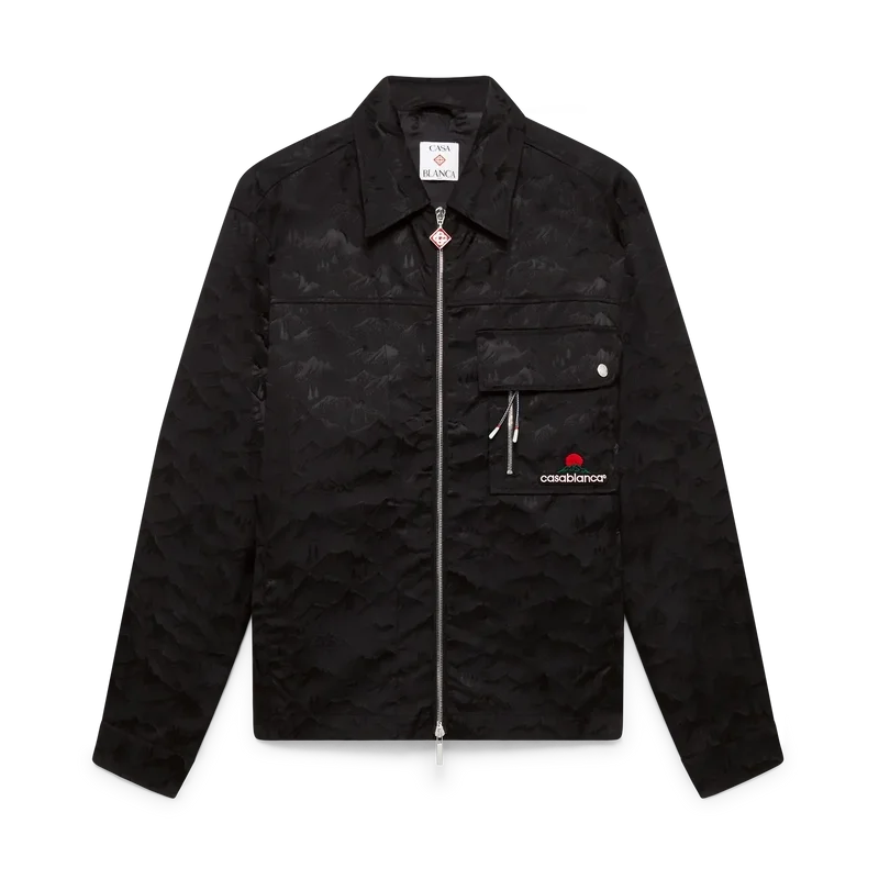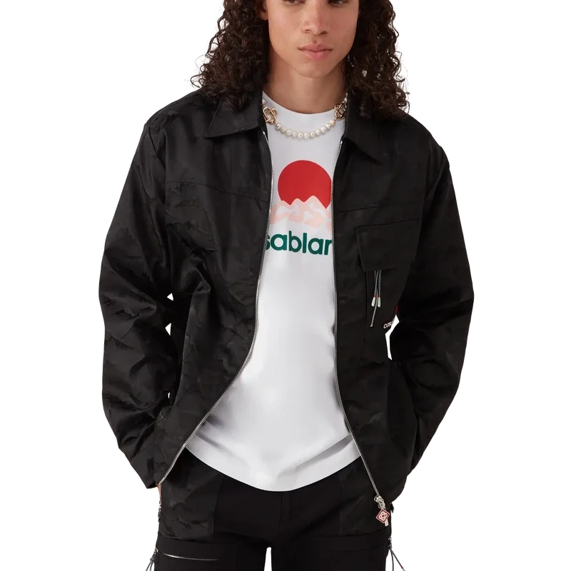 La camicia in nylon con zip e motivo mimetico Mountain è un modello a maniche lunghe realizzato in tessuto jacquard con il caratteristico logo a rombi della Maison. Completata da colletto a punta, chiusura con zip con linguetta recante il logo a diamante della Maison, tasca a patta sul petto con zip verticale e cordini ispirati alle corde da alpinismo di questa stagione, dettagli metallici con marchio sui polsini e sulla tasca, e il logo “Casa Montagne” della Maison: un logo che a prima vista sembra una montagna, ma che osservando più da vicino si legge come “Casa”.