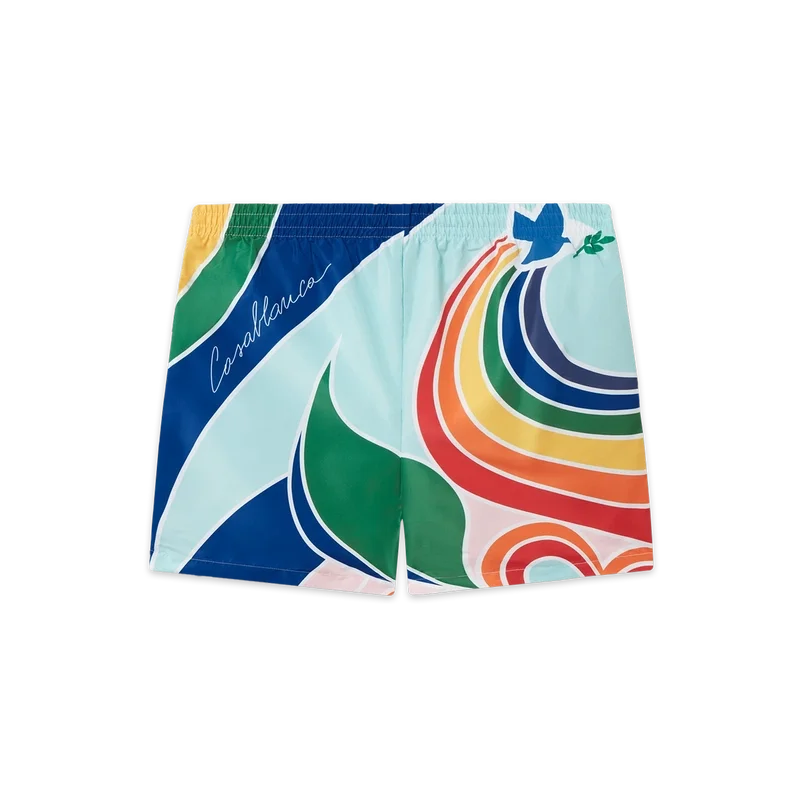 I pantaloncini da bagno Le Pouvoir Des Fleurs sono un capo essenziale per l’estate, realizzati in tessuto tecnico di poliestere con una stampa stagionale che incorpora la simbologia di Casablanca e l’iconografia araba. Sono dotati di elastico in vita, chiusura con coulisse e tasche laterali.