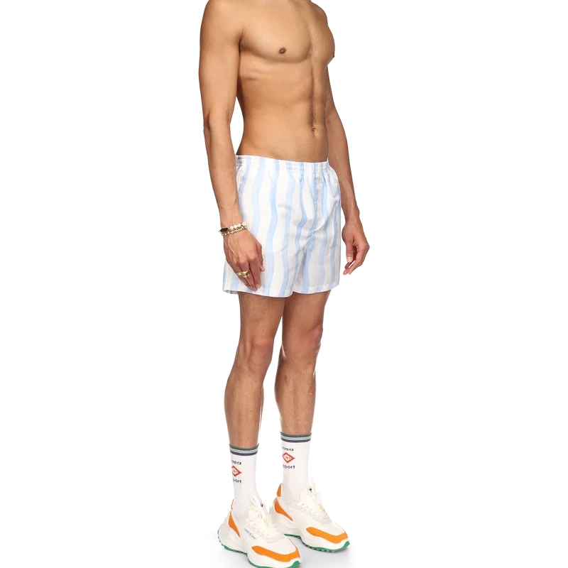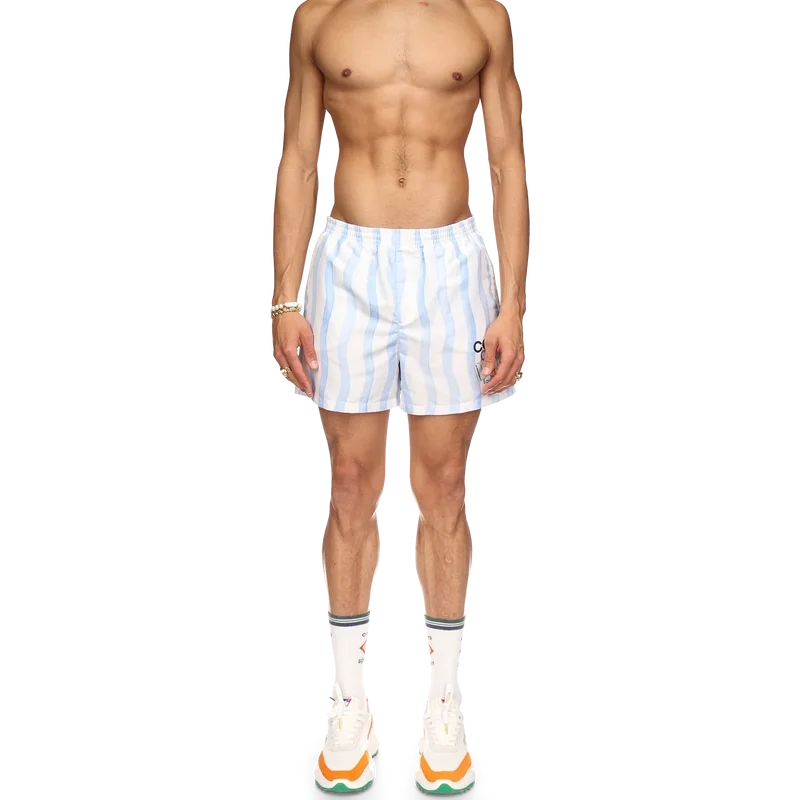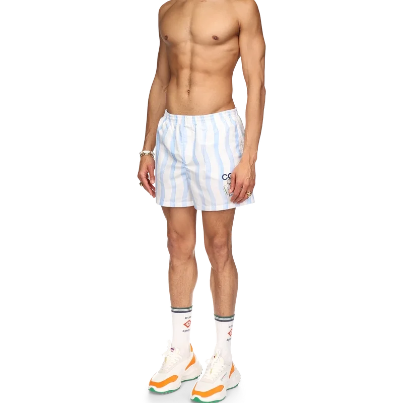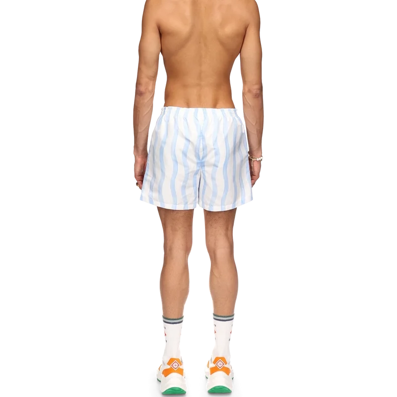 I pantaloncini da bagno Wave presentano il design Memphis Wave della Maison, realizzati in tessuto di poliestere con elastico in vita, tasche laterali e fodera. Completi di etichetta con il marchio Casablanca e grafica stagionale della Maison.