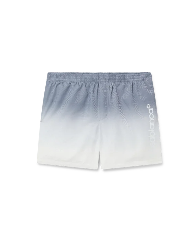 I pantaloncini da bagno in jacquard sfumato sono un modello con stampa all-over realizzato in tessuto di poliestere traspirante. Sono dotati di elastico in vita con coulisse interna, tasche interne e fodera.