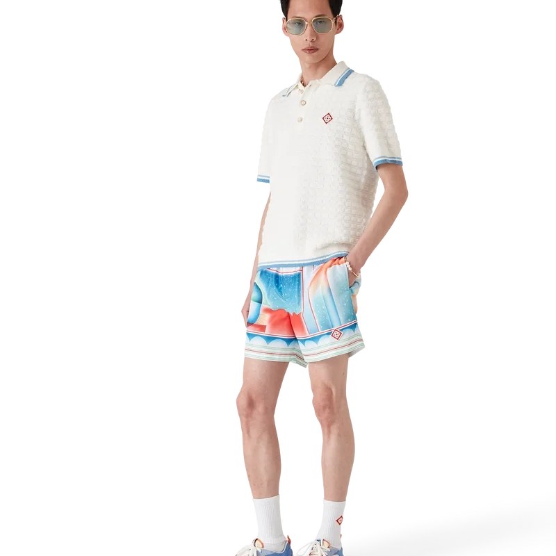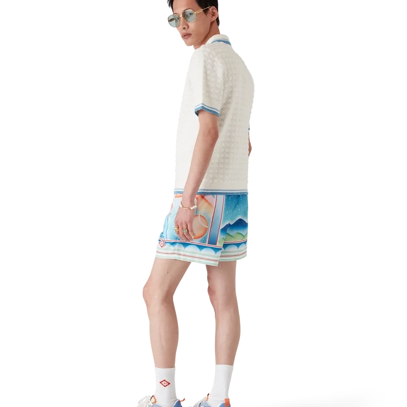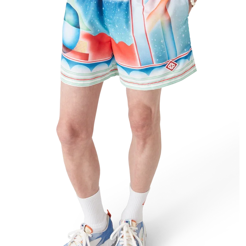 I pantaloncini da bagno Galaxy Court presentano una stampa all-over con la grafica distintiva della Maison, uno dei nostri emblemi, che riprende ancora una volta il nostro layout classico ma con un mix di elementi stagionali, introducendo il tema del tennis nella collezione; realizzati in tessuto tecnico da bagno.