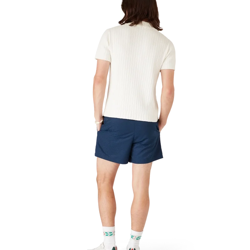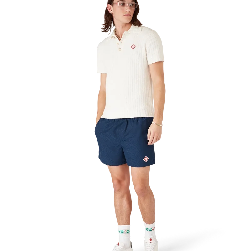 I pantaloncini da bagno jacquard da uomo sono un raffinato modello realizzato in tessuto tecnico per costumi da bagno con il caratteristico logo a rombi della Maison. Rifiniti con elastico in vita e chiusura con coulisse in blu navy.