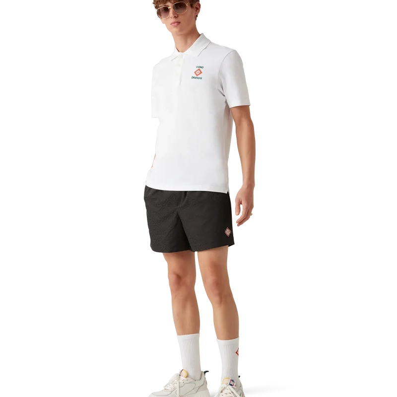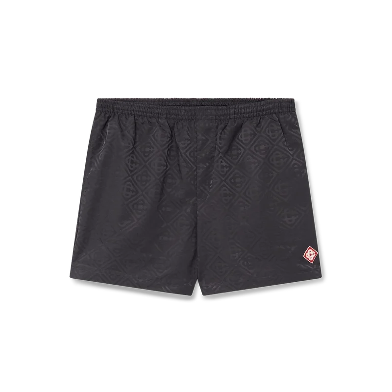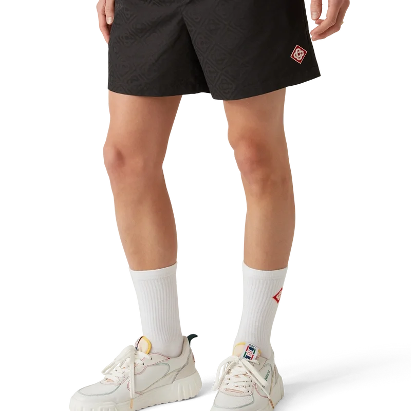 I pantaloncini da bagno in jacquard presentano una stampa all-over e sono realizzati con il tessuto Monogram iconico della Maison. Sono rifiniti con una cintura elasticizzata con coulisse interna, tasche interne e fodera in rete.
