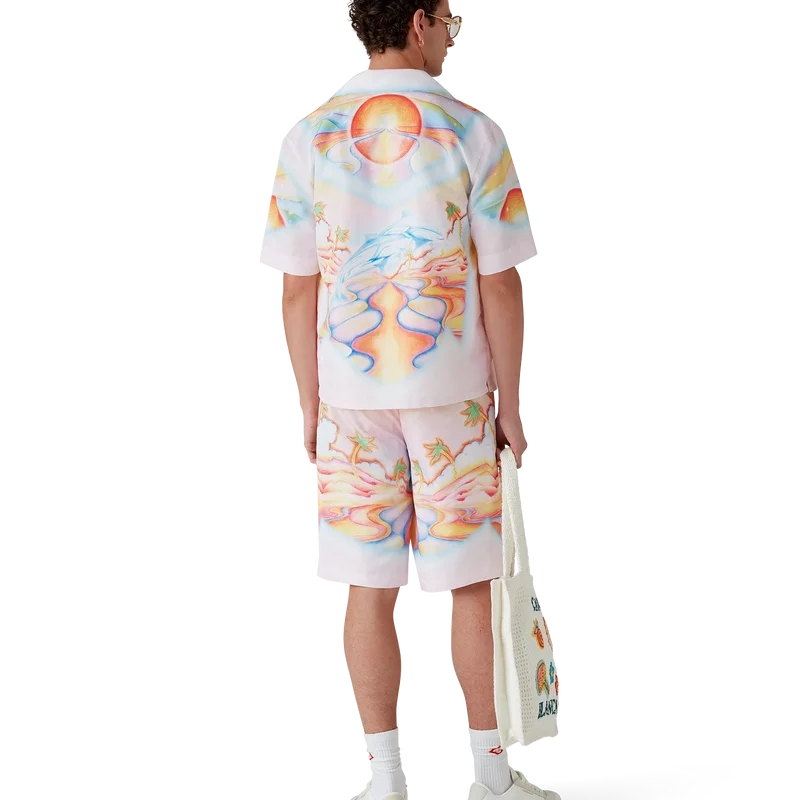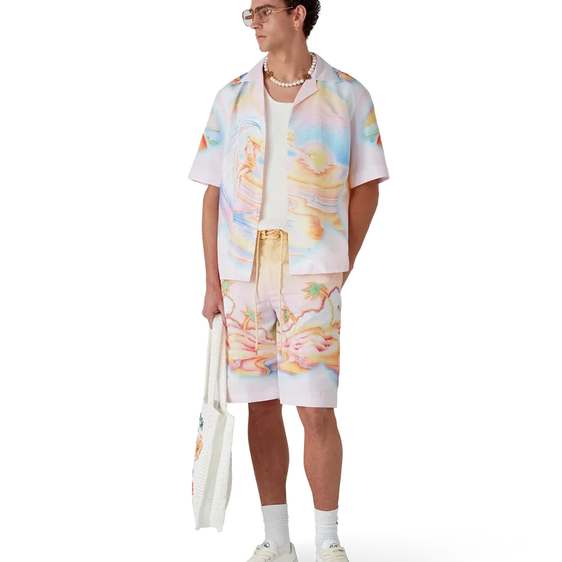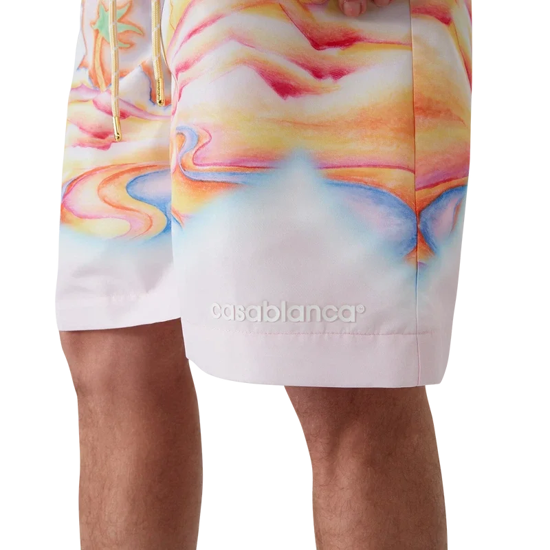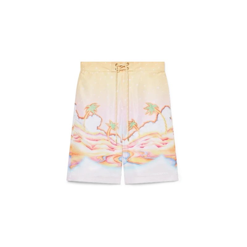 I pantaloncini da bagno Psychedelic Nirvana sono un modello al ginocchio realizzato in tessuto da bagno stampato con una grafica distintiva ispirata alle tavole da surf aerografate della California degli anni ’70, utilizzando colori pastello che conferiscono alla stampa un’atmosfera quasi onirica e idealistica. Completati da una cintura elasticizzata, chiusura con coulisse, tasche frontali e fodera in rete.