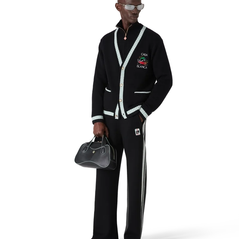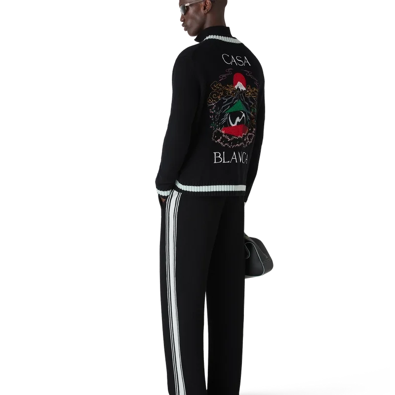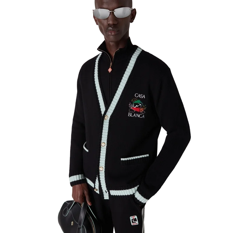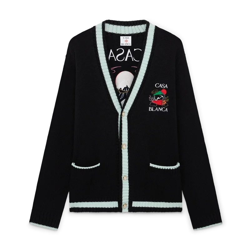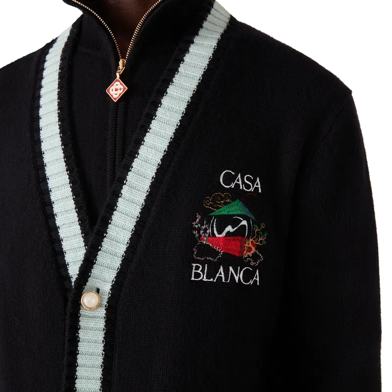 Il cardigan Casa Mountain Temple è un modello a maniche lunghe caratterizzato da un motivo stagionale ricamato, realizzato in tessuto di lana merino. Rifinito con classico girocollo, polsini e orlo a costine.
