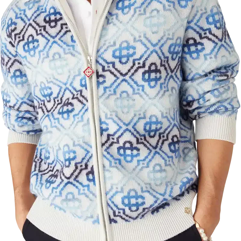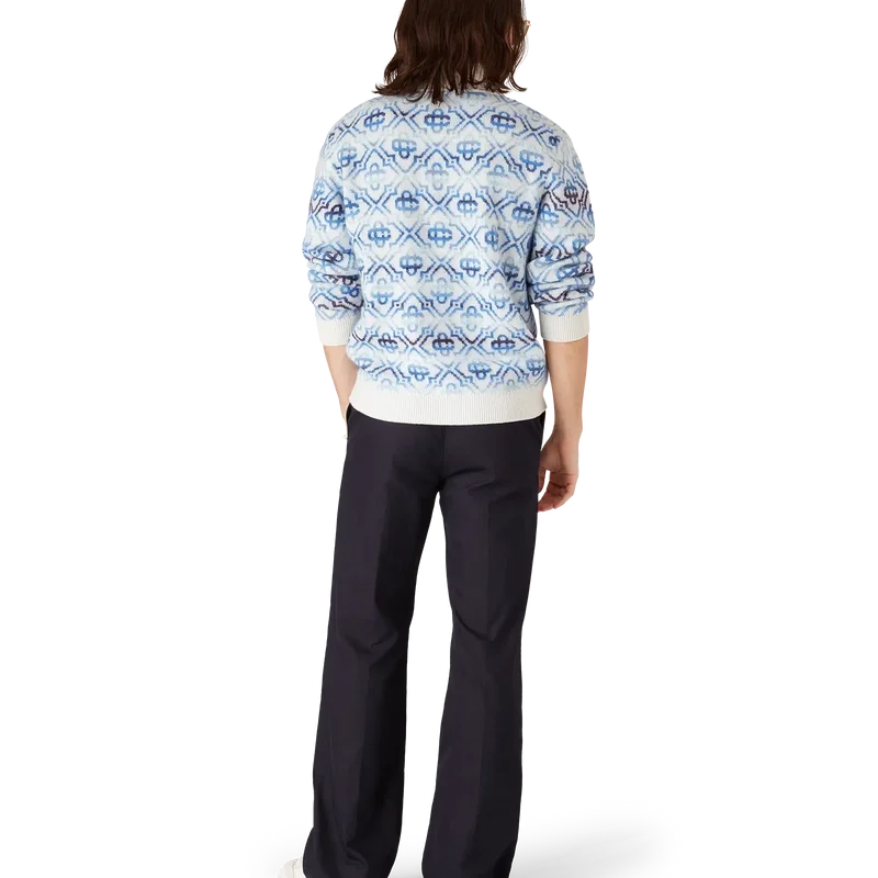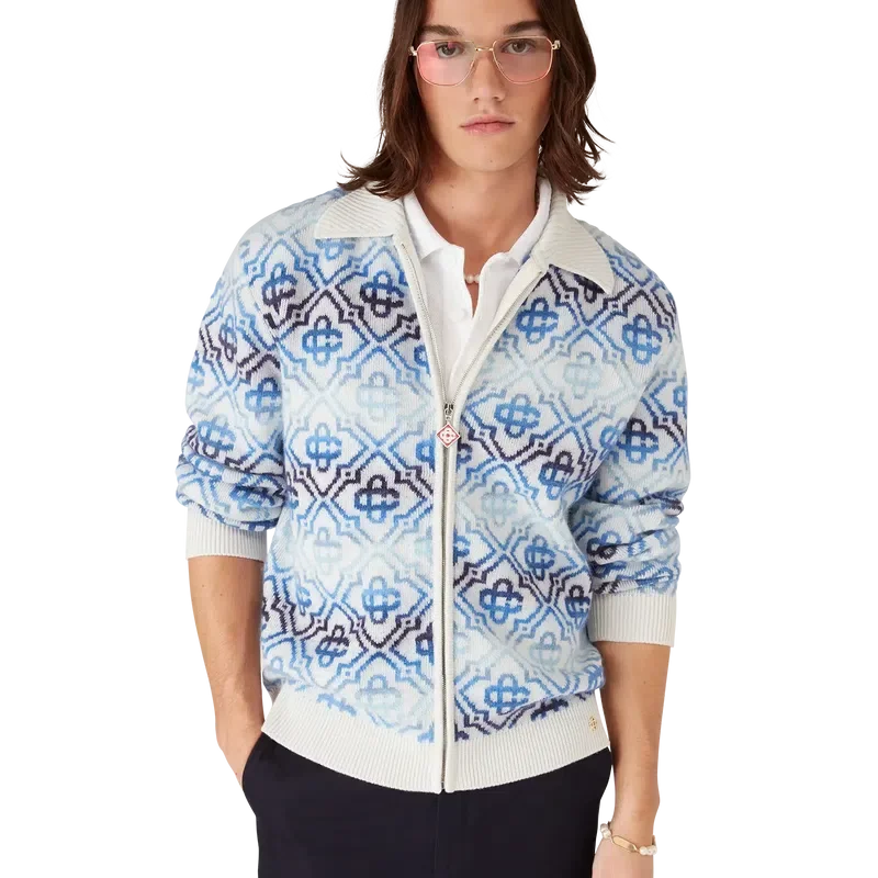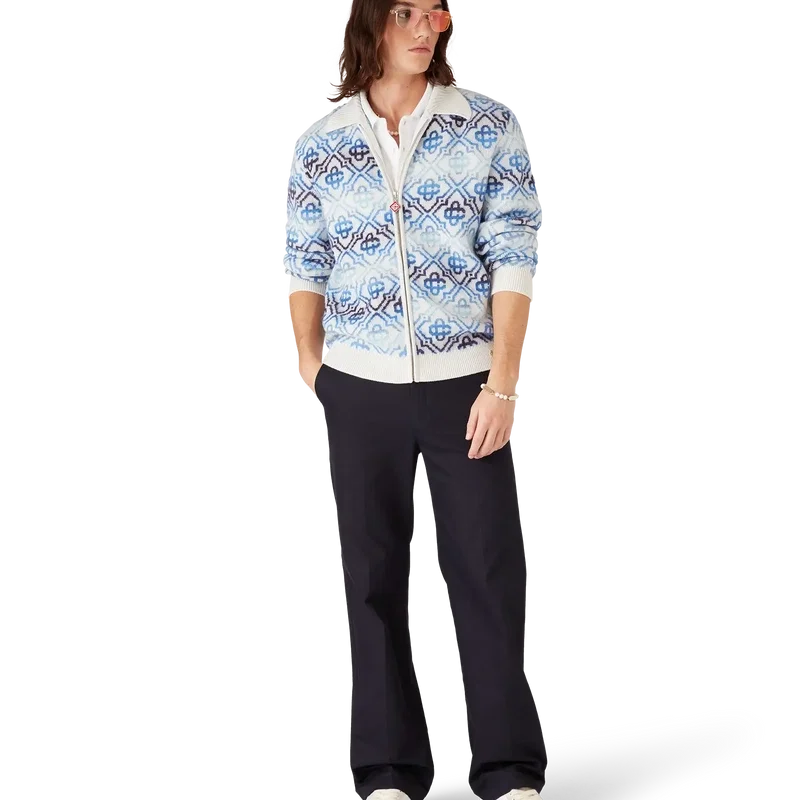 Il cardigan in lana merino a maniche lunghe con monogramma Space Dye è un raffinato capo in maglia che presenta il monogramma iconico della Maison in una sfumatura blu, realizzato con filati tinti a effetto space dye che creano profondità e dimensione. Completato da chiusura con zip con linguetta con il logo a diamante iconico della Maison e dettagli a costine su collo, polsini e orlo.