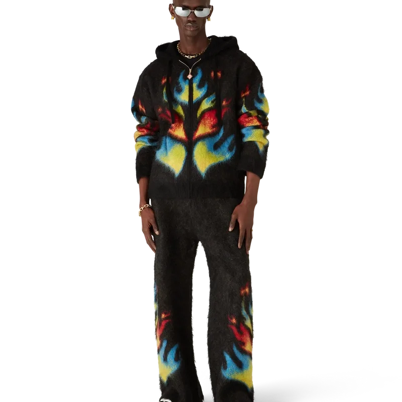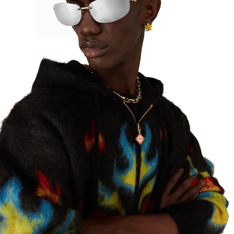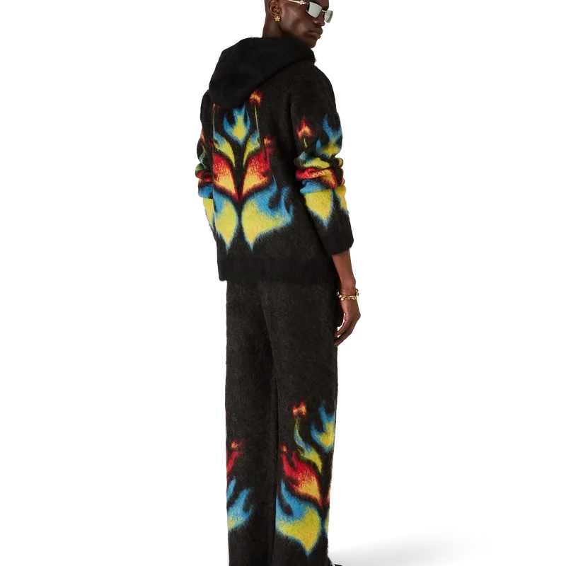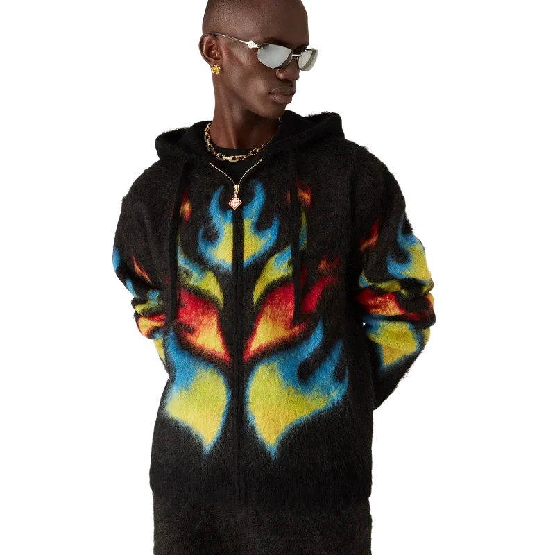 La felpa con cappuccio e zip Mohair Flame Laurel è un modello in maglia a maniche lunghe che propone una rivisitazione del nostro top Laurel della collezione Nigerian, traendo ispirazione dalle grafiche audaci delle maglie da calcio. Rifinita con chiusura a zip, cappuccio con coulisse, polsini e orlo a costine.