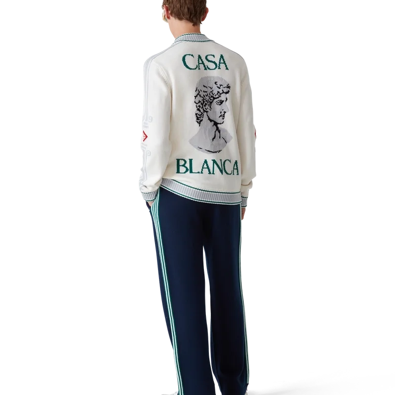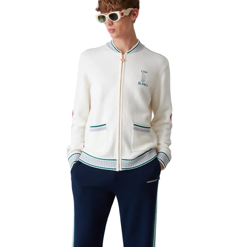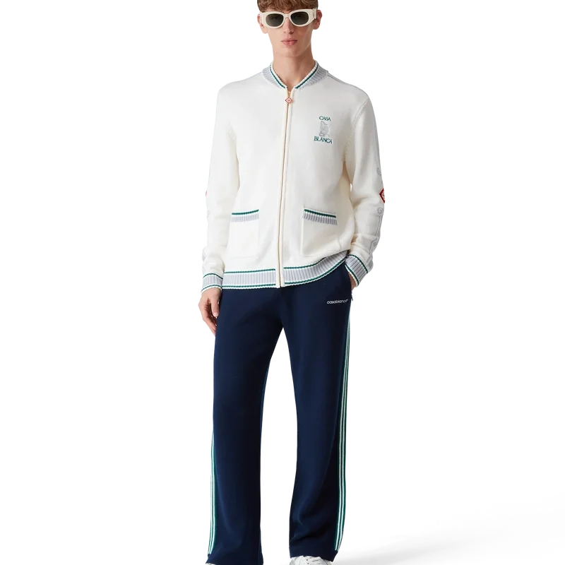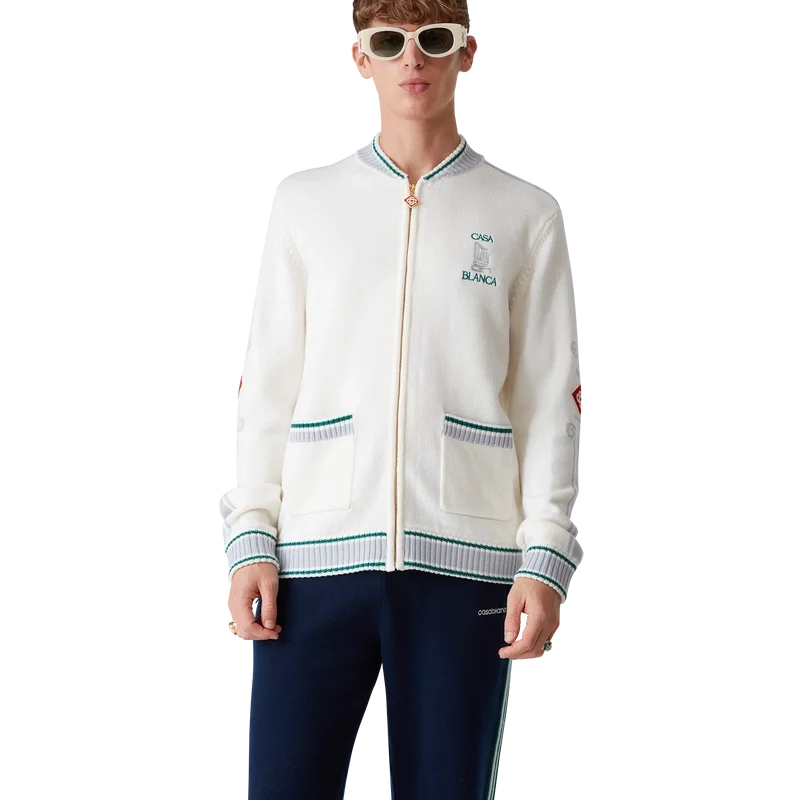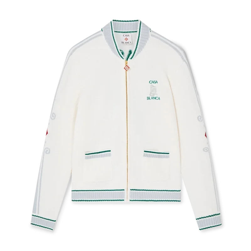 La giacca Casa Club è un classico modello a maniche lunghe realizzato in tessuto di lana merino con motivi stagionali ispirati allo studio continuo della bellezza classica e del fascino contemporaneo dell’antica Grecia. Rifinita con chiusura frontale con zip, dettagli a colonna lungo le maniche, tasche applicate sul davanti, collo, polsini e orlo a costine.